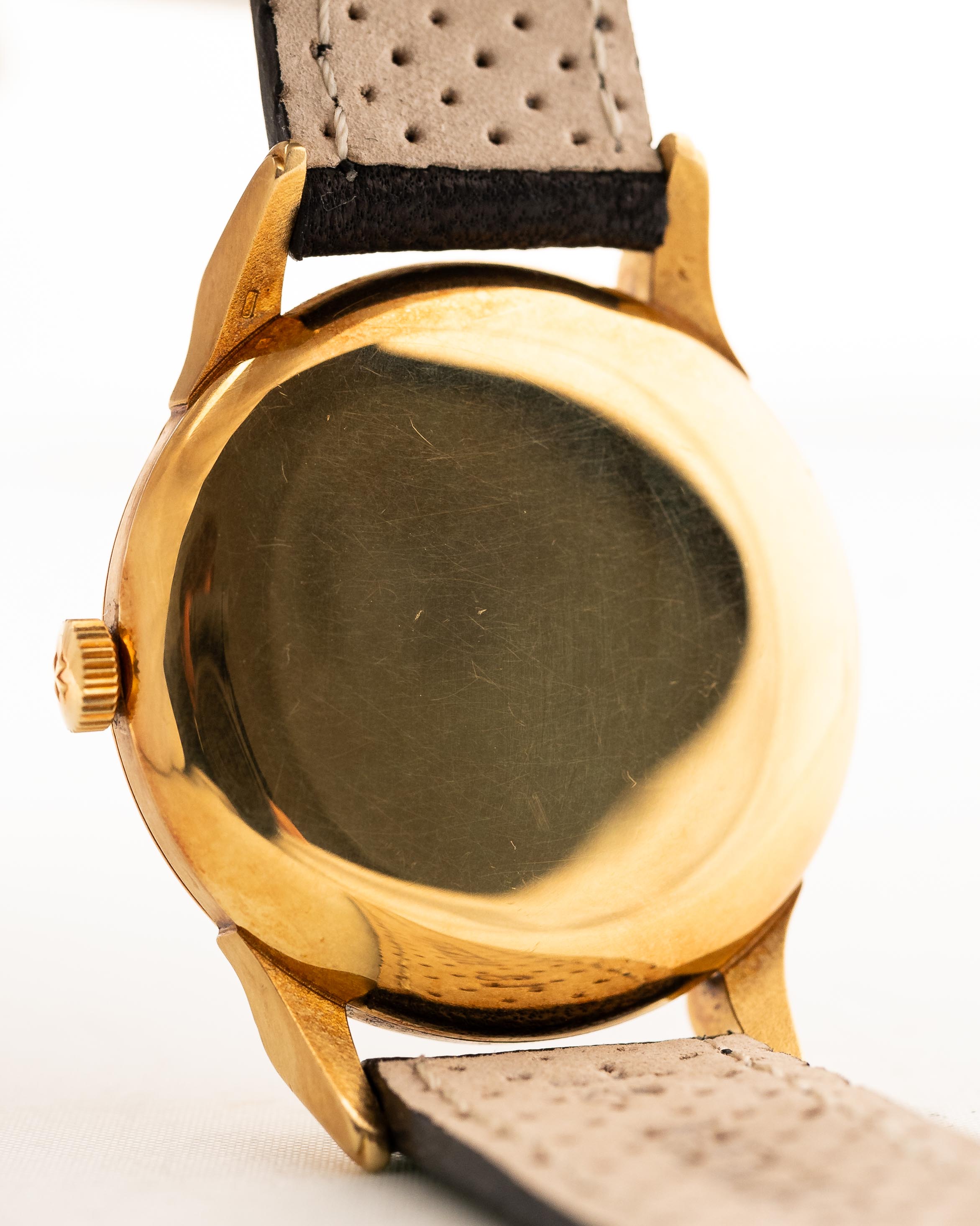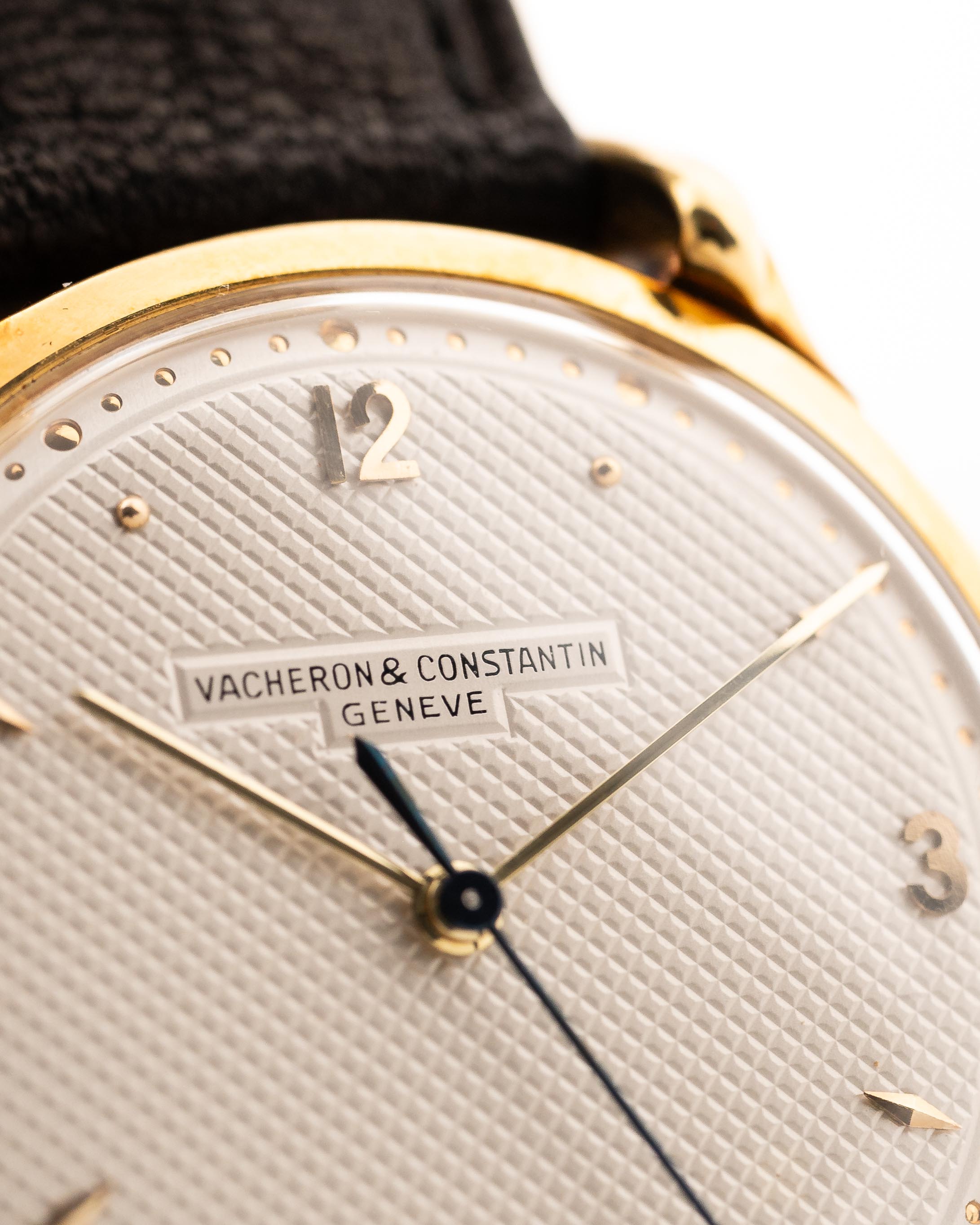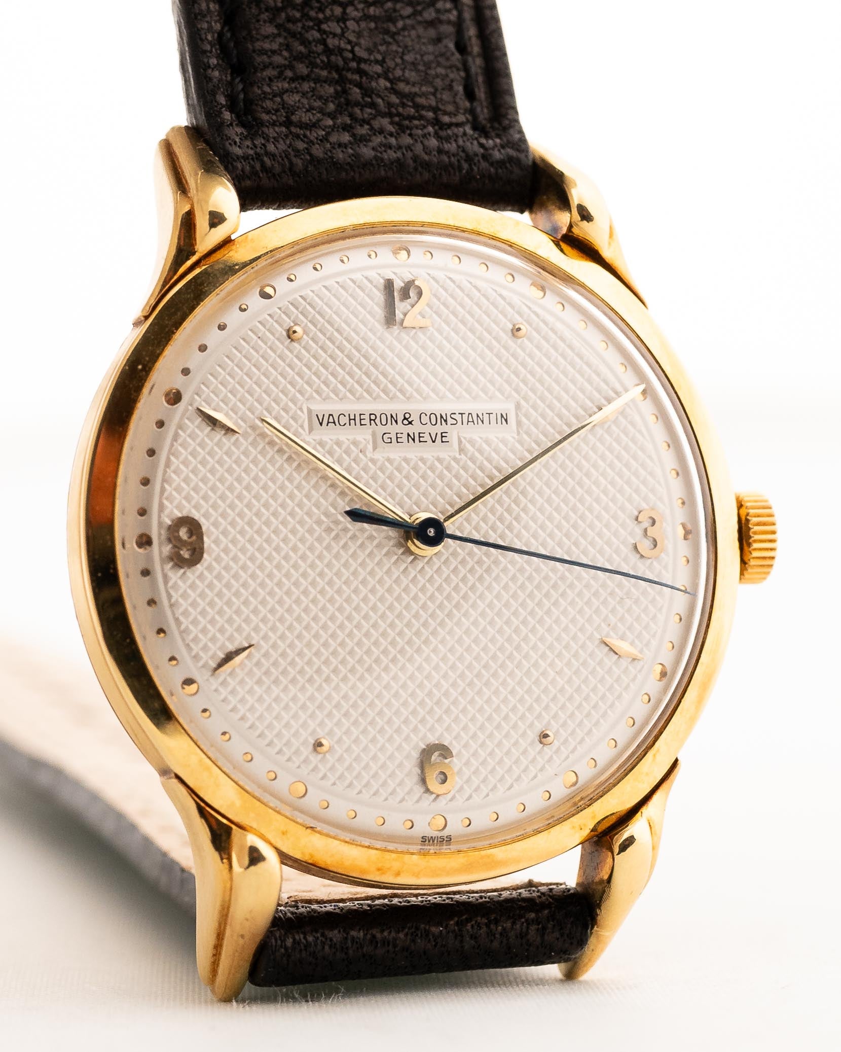 Aquí tenemos un reloj de vestir Vacheron Constantin de la década de 1940, muy raro y bellamente acabado, con unas asombrosas asas de araña y una esfera Guilloché de diseño asombroso con disposición tres, seis, nueve, doce. Los marcadores de hora dorados en forma de diamante y redondos entre ellos, el minutero dorado y el juego de agujas agradan aún más a la vista.