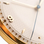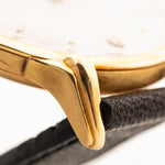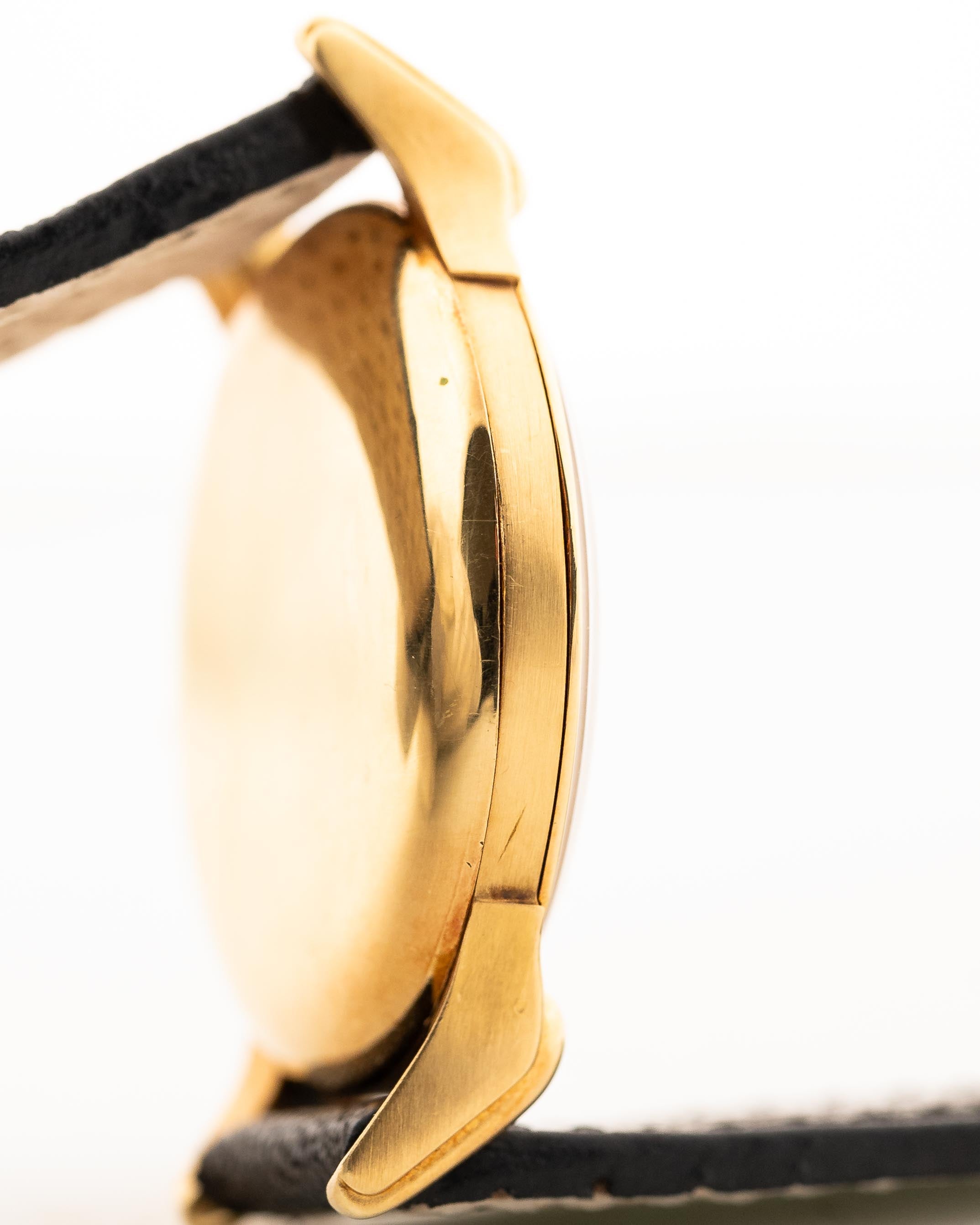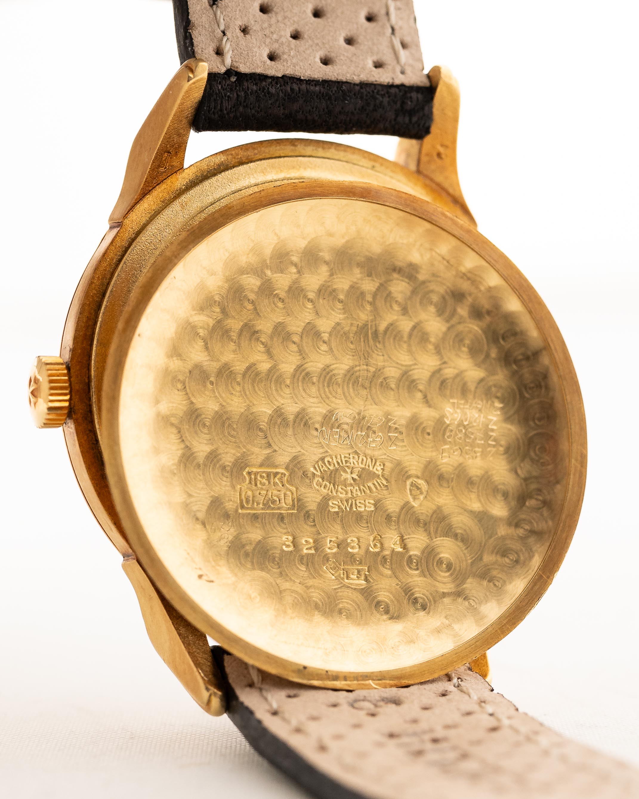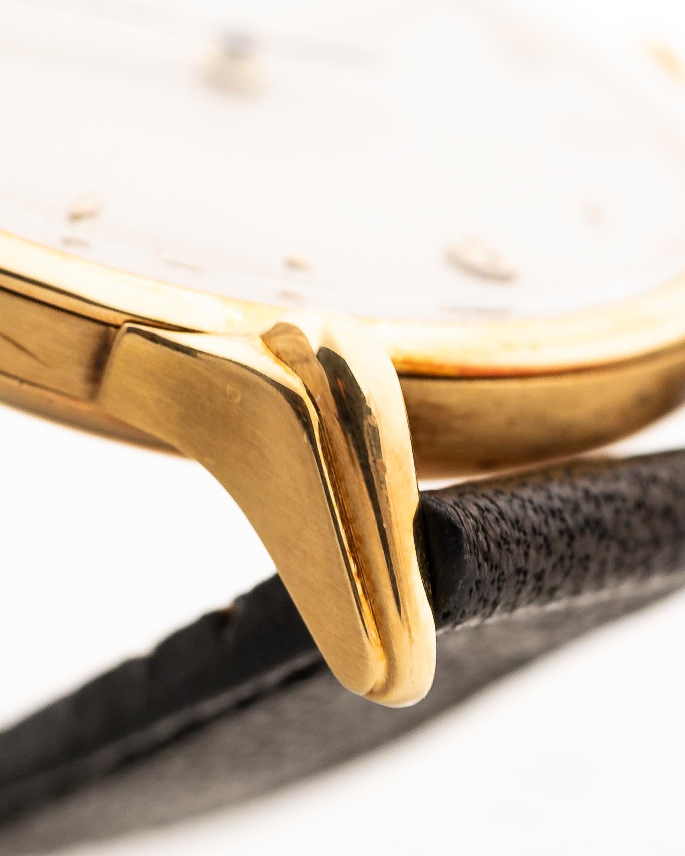Aquí tenemos un reloj de vestir Vacheron Constantin de la década de 1940, muy raro y bellamente acabado, con unas asombrosas asas de araña y una esfera Guilloché de diseño asombroso con disposición tres, seis, nueve, doce. Los marcadores de hora dorados en forma de diamante y redondos entre ellos, el minutero dorado y el juego de agujas agradan aún más a la vista.