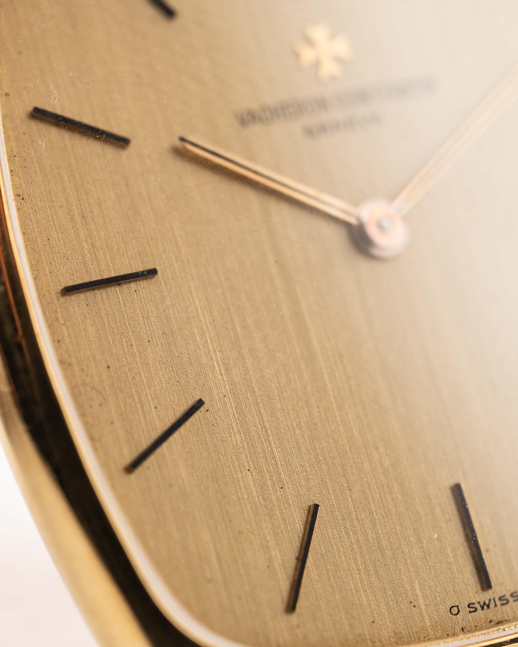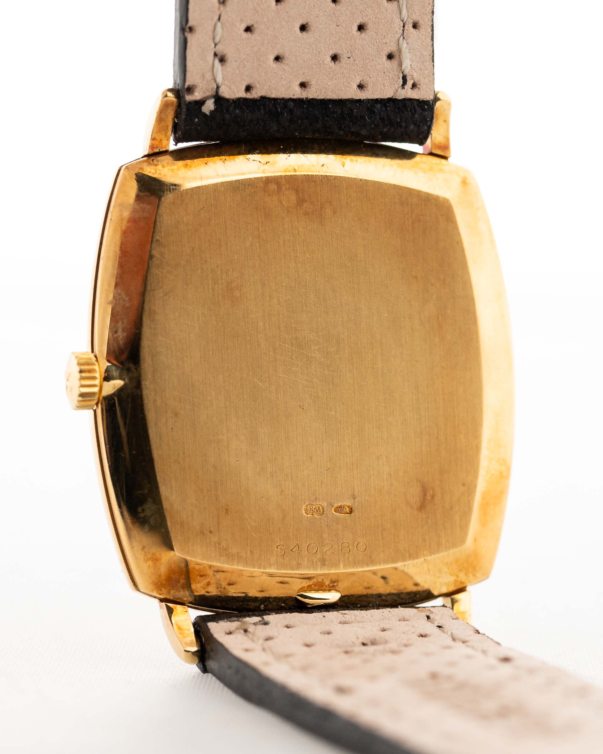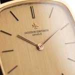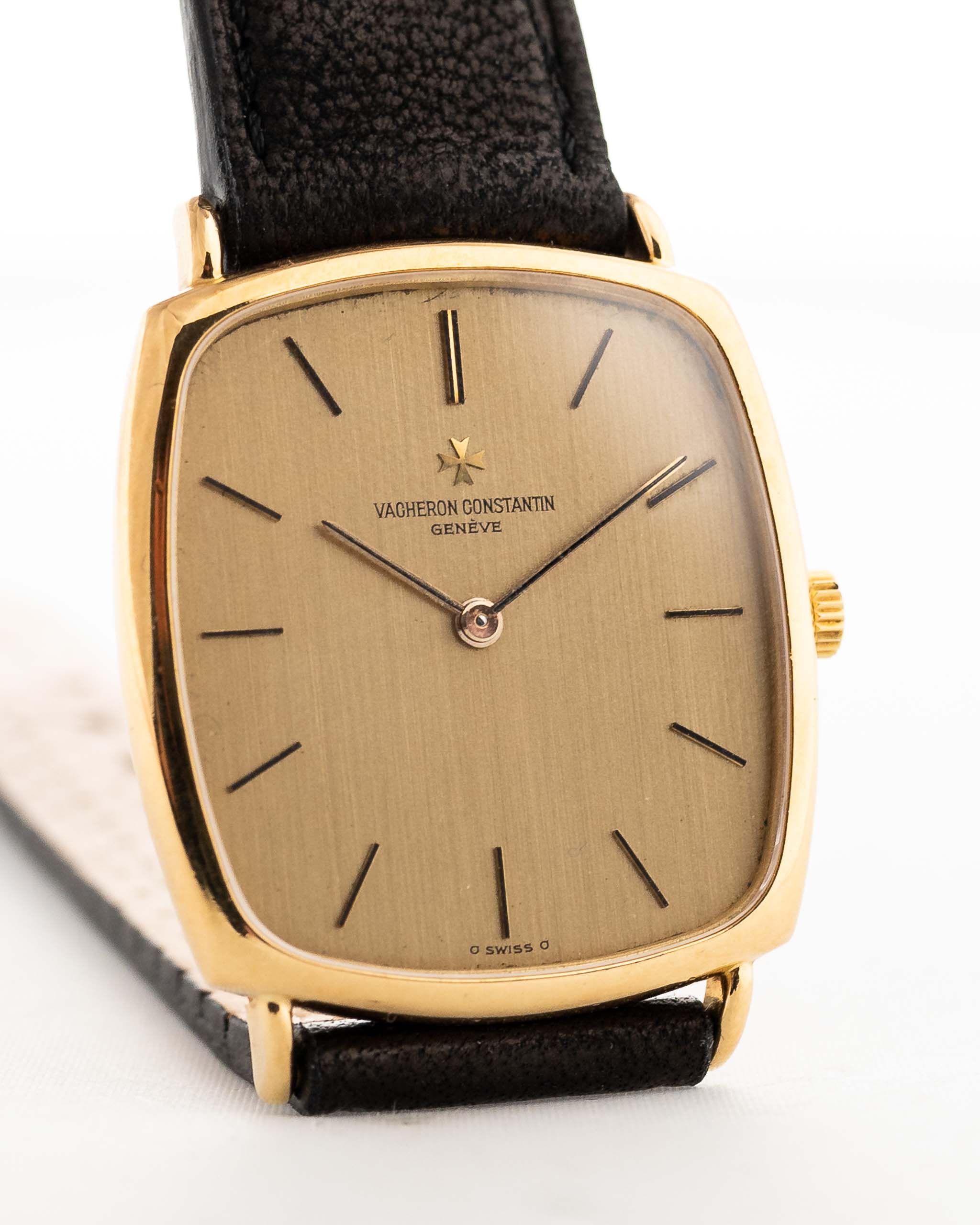 Aquí tenemos un precioso reloj de vestir Vacheron Constantin de oro amarillo de 18 quilates con un diseño rectangular de los años setenta.