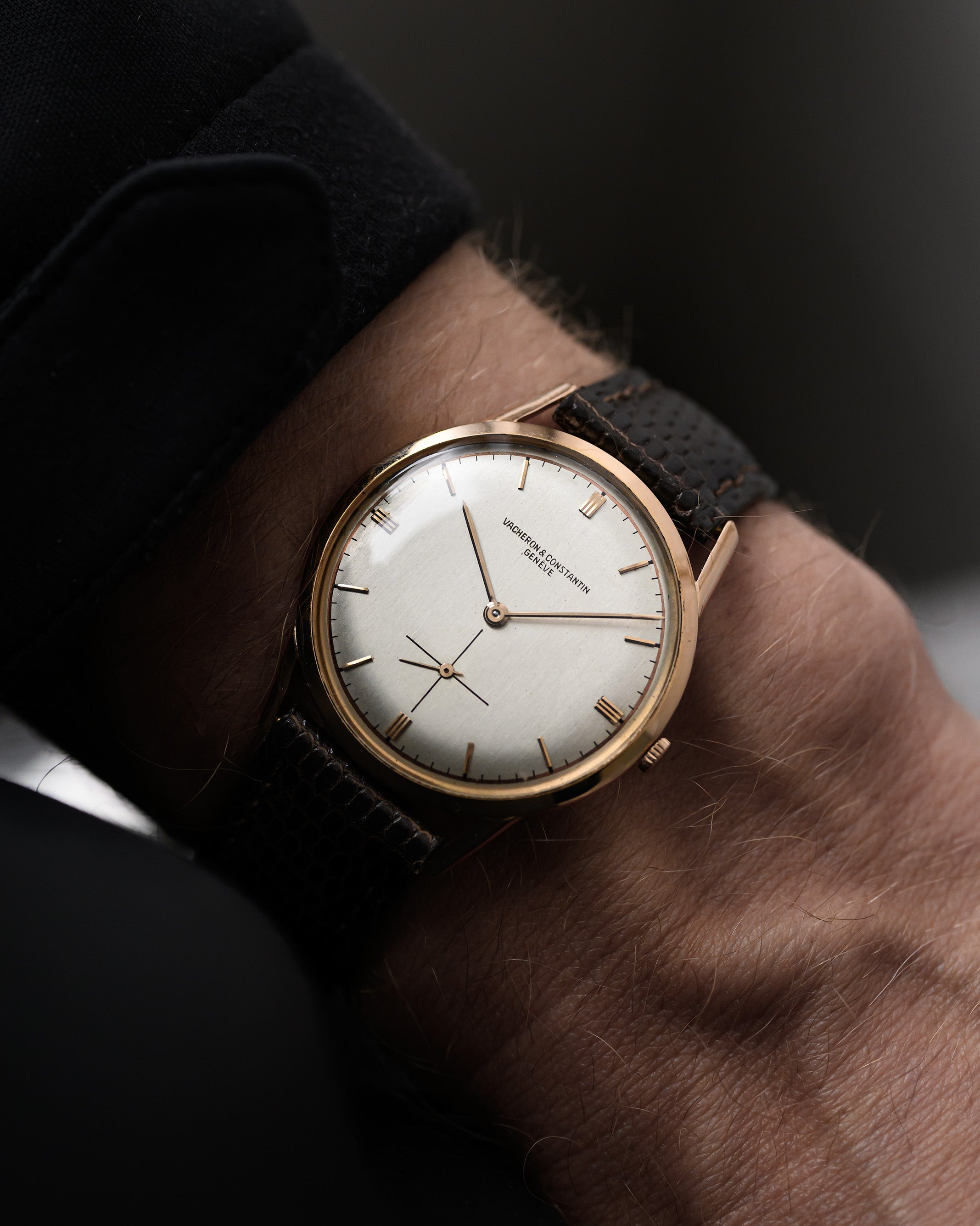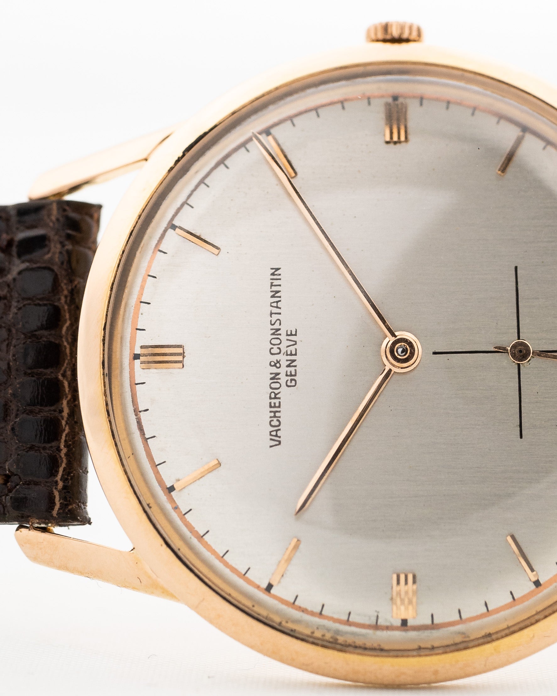Aquí tenemos un reloj de vestir Vacheron Constantin de la década de 1960 con un bonito acabado y una esfera plateada de diseño asombroso, segundero secundario y marcadores horarios y agujas de filigrana de oro rosa.