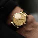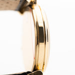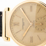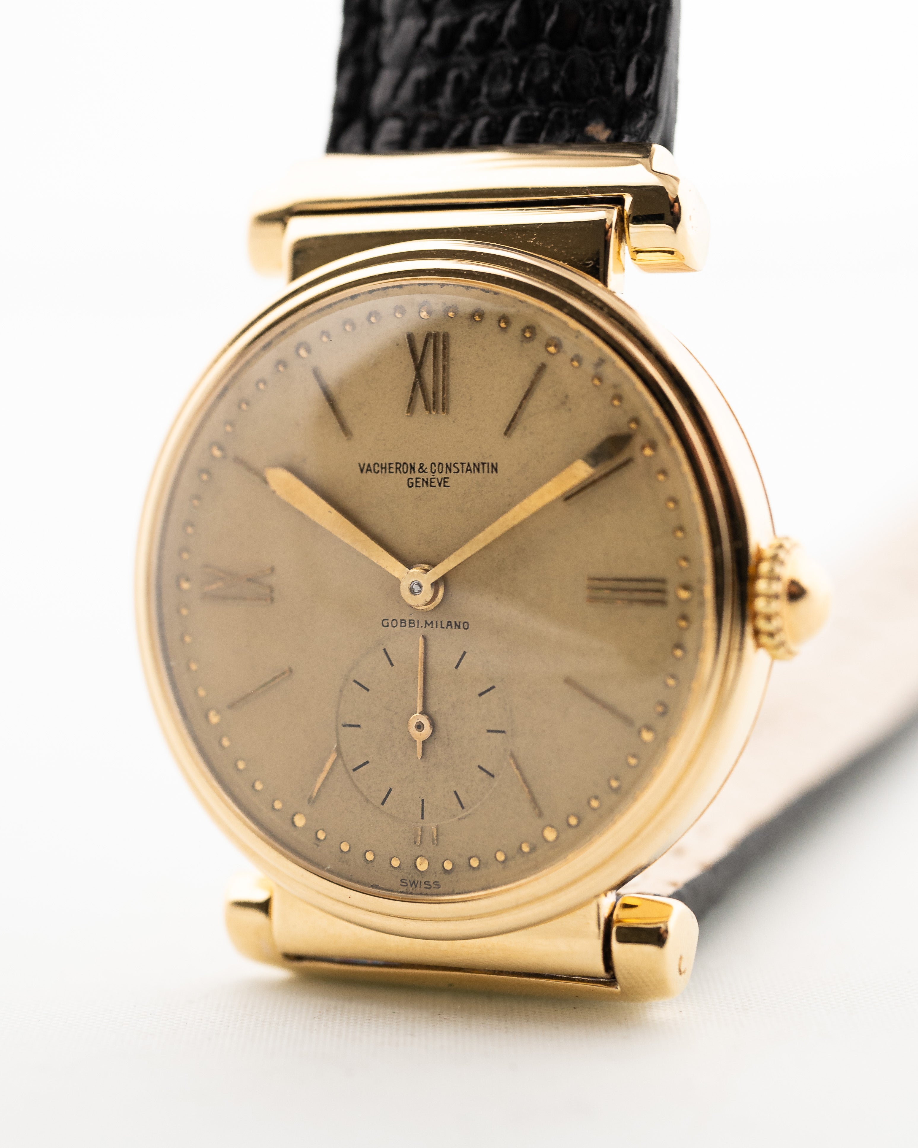 Aquí tenemos un precioso reloj de vestir Vacheron Constantin de oro amarillo de 18 quilates de los años treinta. Podría tratarse de una pieza 1/1 debido a las rarísimas asas con capucha y a la esfera con doble firma del distribuidor italiano Gobbi Milano.