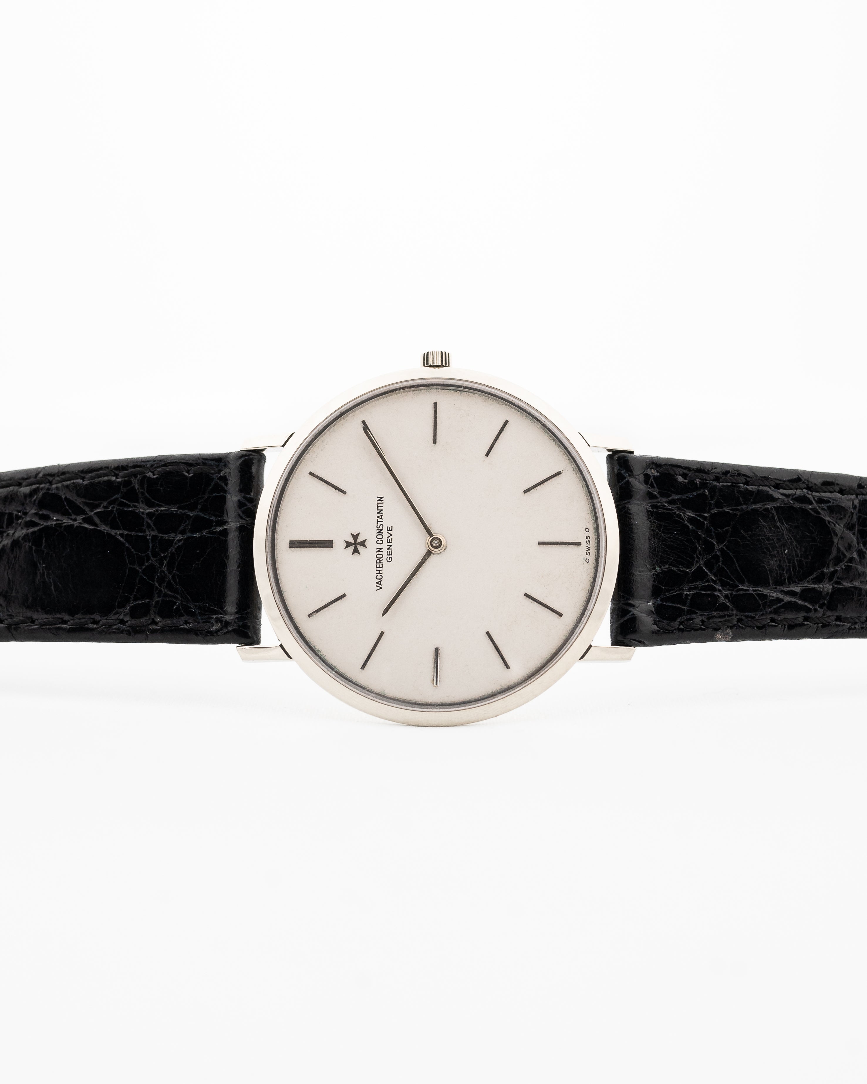 Aquí tenemos un precioso reloj de vestir Vacheron Constantin Ultra Flat de oro blanco de 18 quilates de los años 60 con una limpia esfera blanca.