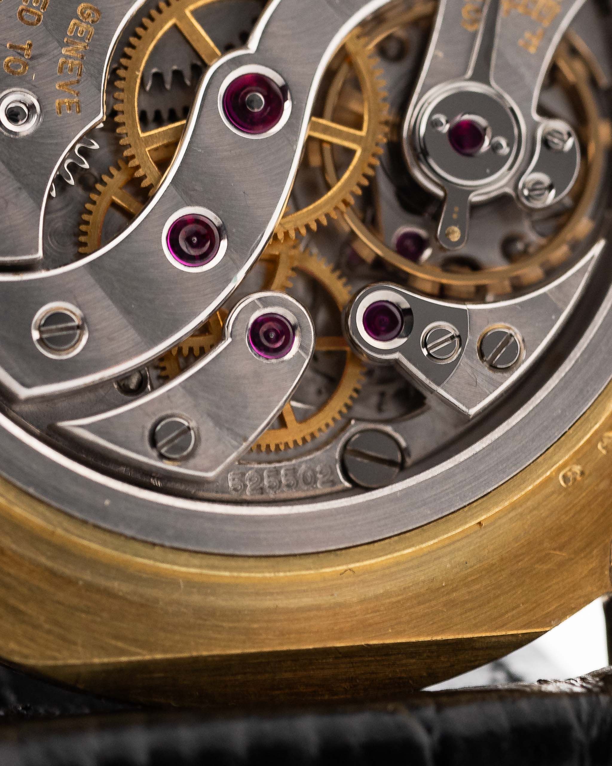 Su caja ultrafina de oro rosa de 18 quilates, elaborada por el renombrado fabricante de cajas Eggly & Cie, enmarca una esfera plateada cepillada verticalmente de gran belleza con índices horarios minimalistas de oro, sub-segundos a las seis y delicadas agujas bastón. El equilibrio de proporciones y acabados define la estética atemporal que sigue guiando hoy la colección Patrimony.