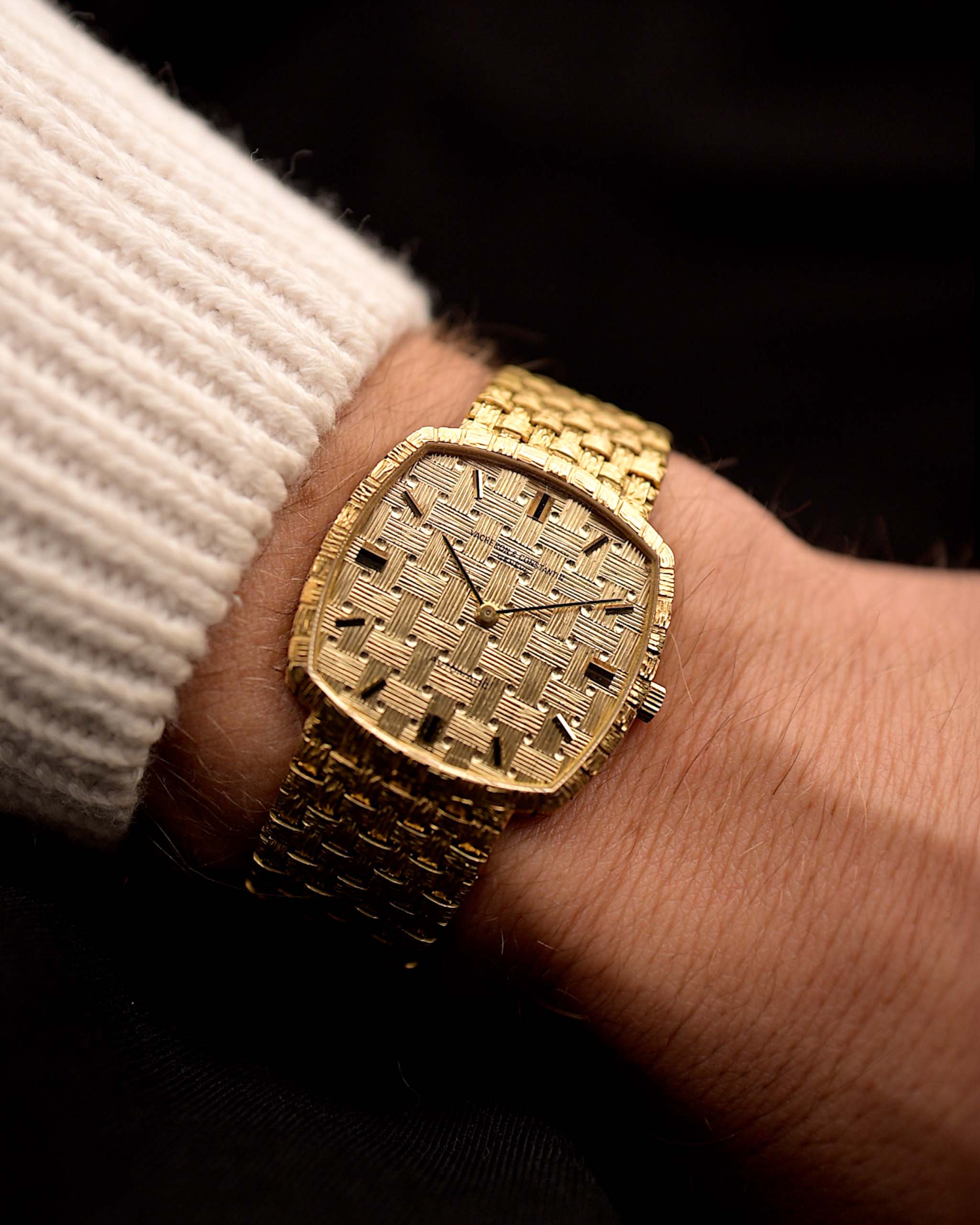 La Ref. 7391 , una expresión excepcional y llamativa del diseño de Vacheron Constantin de la década de 1970, combina la caja, la esfera y el brazalete en una estética de tejido de cesta sin costuras. Fabricado íntegramente en oro amarillo de 18 quilates, su brazalete tejido integrado se adapta como una segunda piel: suave, escultural e inconfundiblemente lujoso.