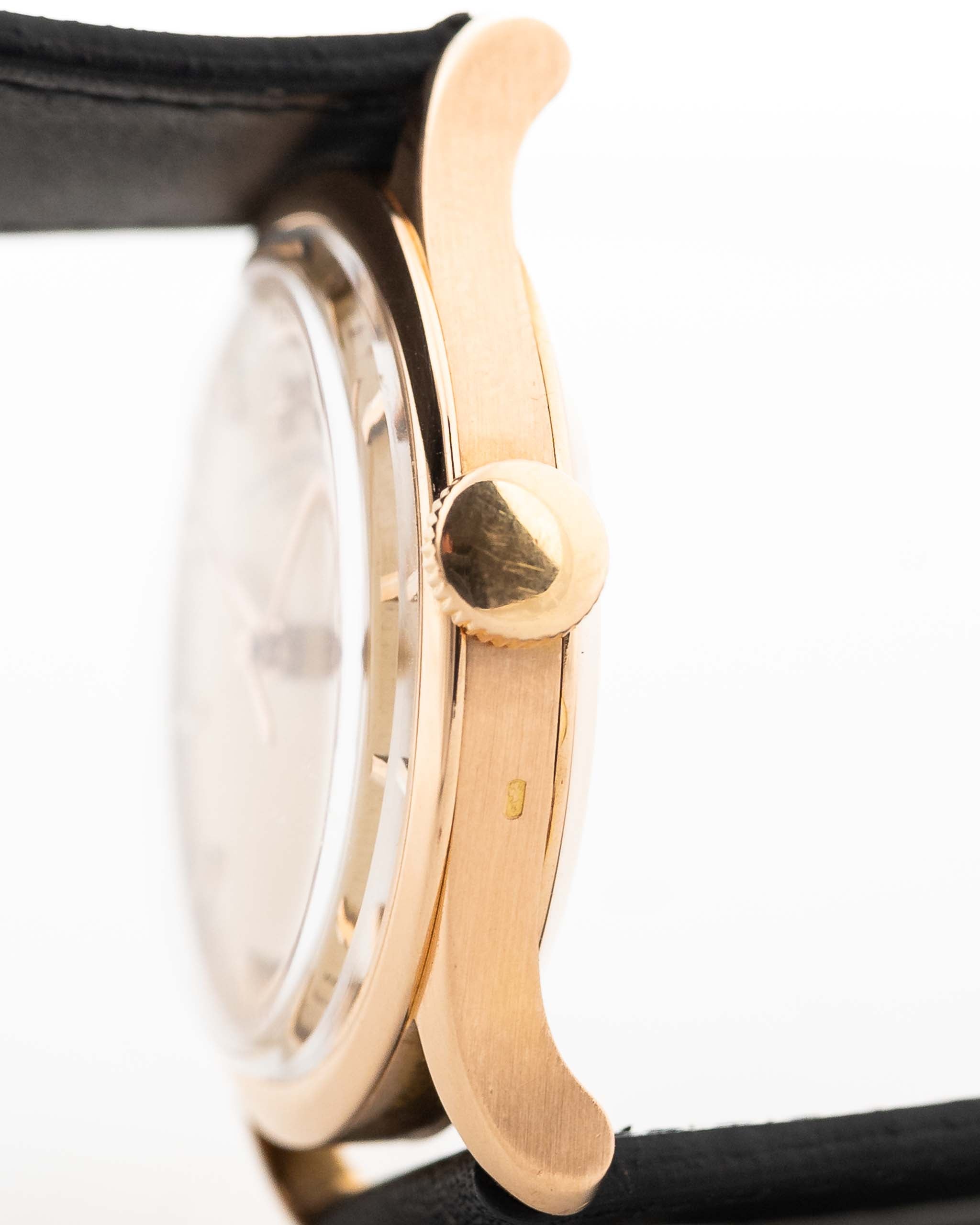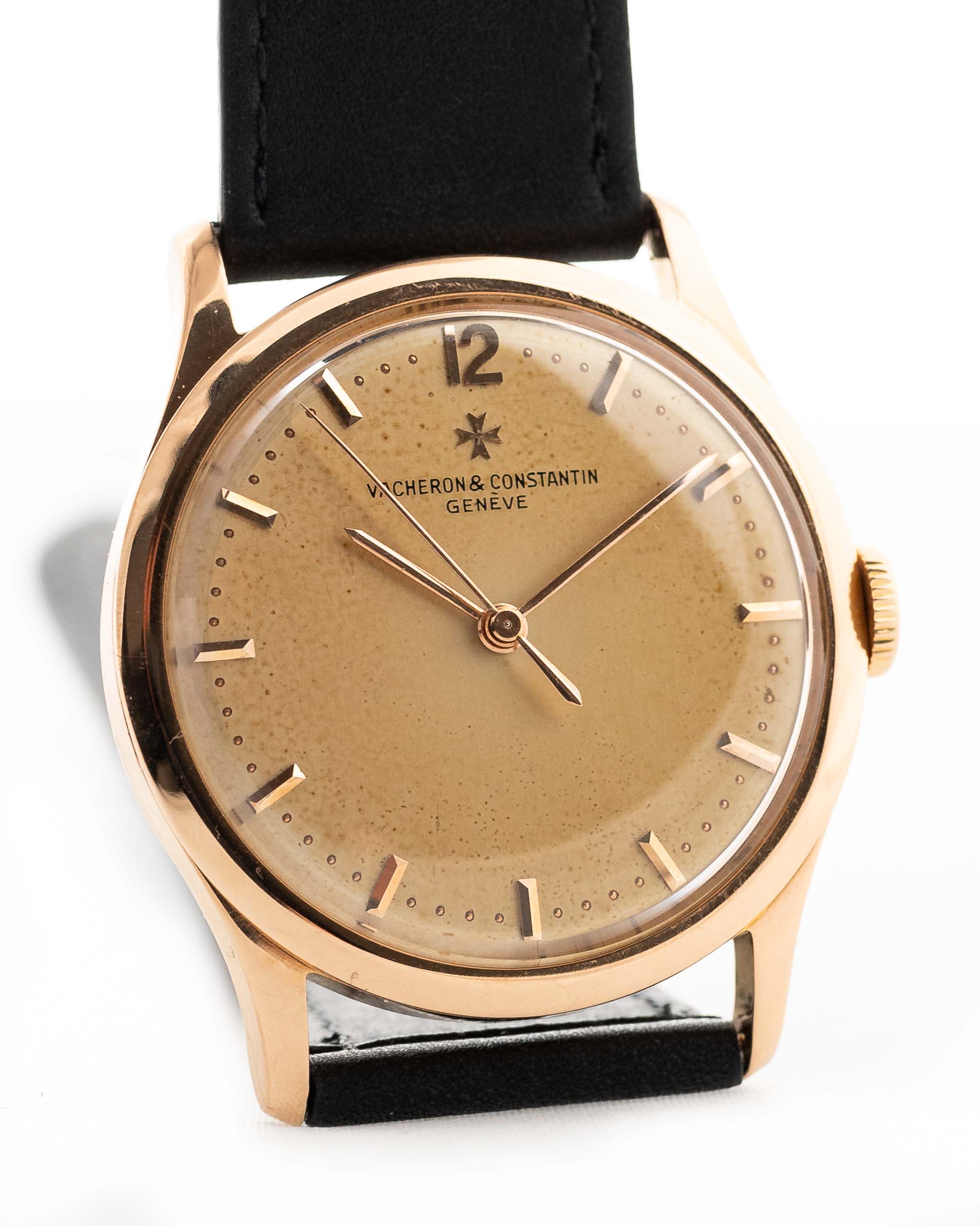 Aquí tenemos un reloj de vestir Vacheron Constantin de la década de 1950, muy raro y bellamente acabado, con una impresionante caja de oro rosa de 18 quilates Antoine Gerlach SA y una elegante esfera color champán con disposición de las doce mayores.