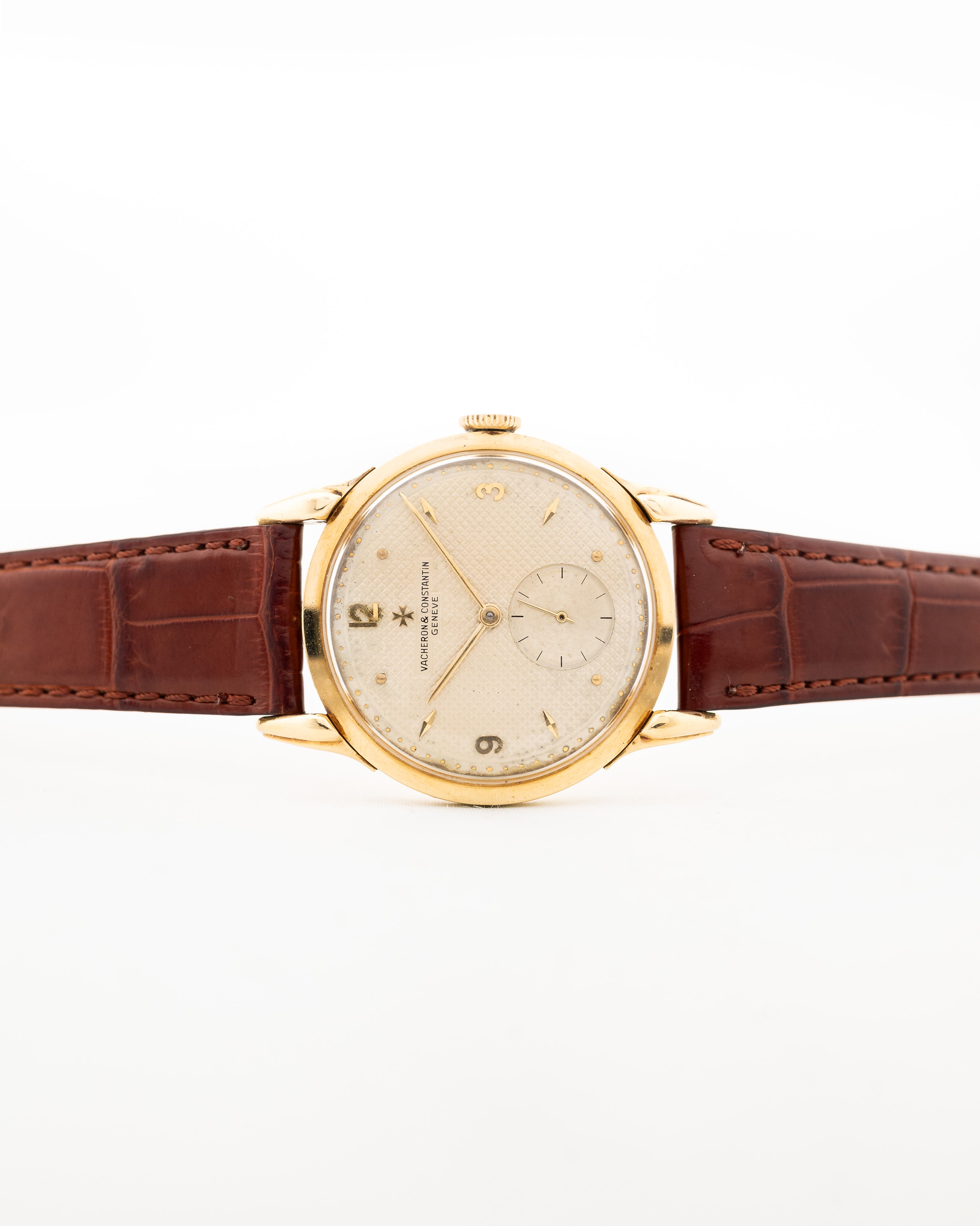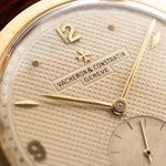 Aquí tenemos un bello ejemplo de un Vacheron Constantin de 36 mm de oro amarillo de 18 quilates con caja Gerlach Grasshopper de 18 quilates de la década de 1950.