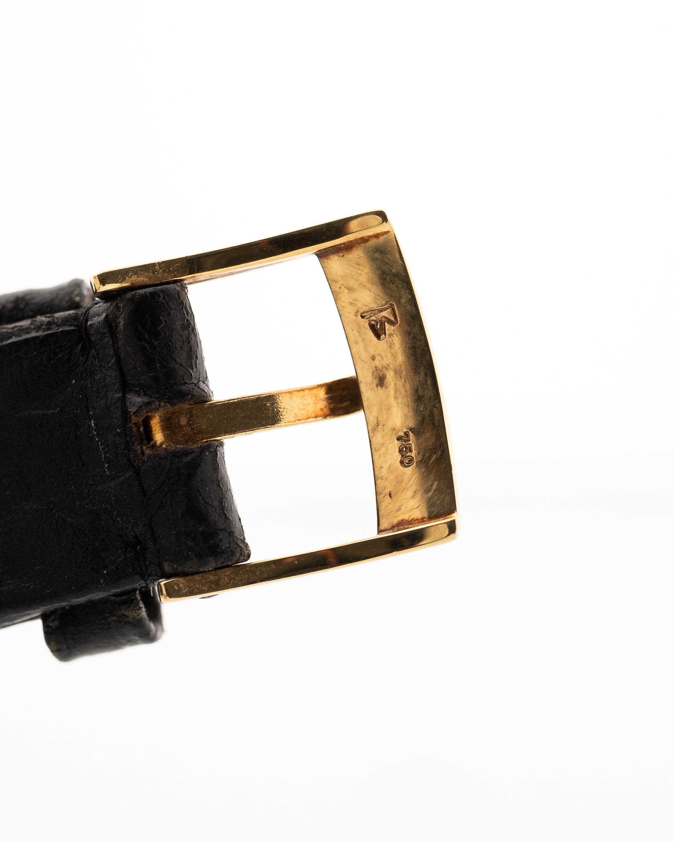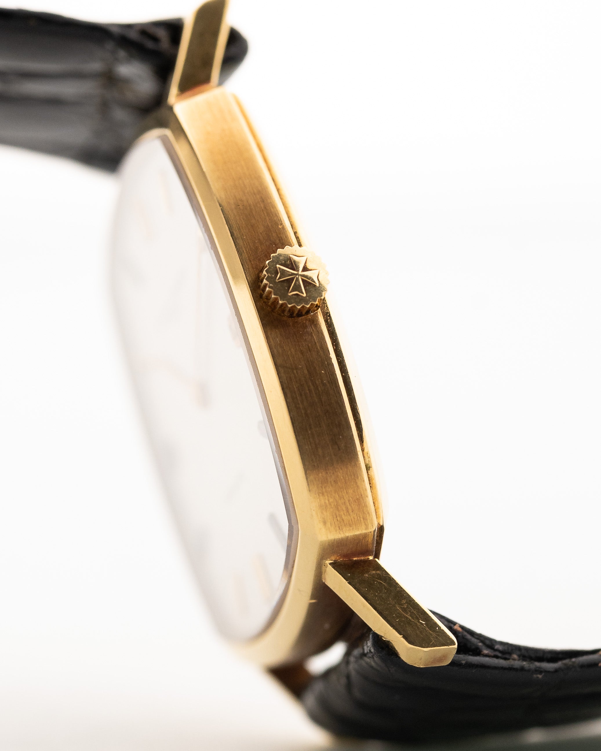Aquí tenemos un reloj de vestir Vacheron Constantin de oro amarillo de 18 quilates con un bonito acabado y un diseño de caja en forma de TV de 1991. Esta pieza en particular destaca por su bella y limpia esfera de lino blanco, sus marcadores horarios de 18 quilates de maravilloso diseño y su robusta caja de oro amarillo de 18 quilates en forma de TV.