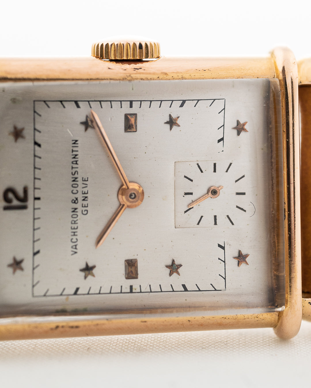 Aquí tenemos un reloj de vestir Vacheron Constantin Rectangular de 1944 bellamente acabado con asas de lágrima únicas y una esfera de diseño asombroso con tantos detalles que es difícil mencionarlos todos.