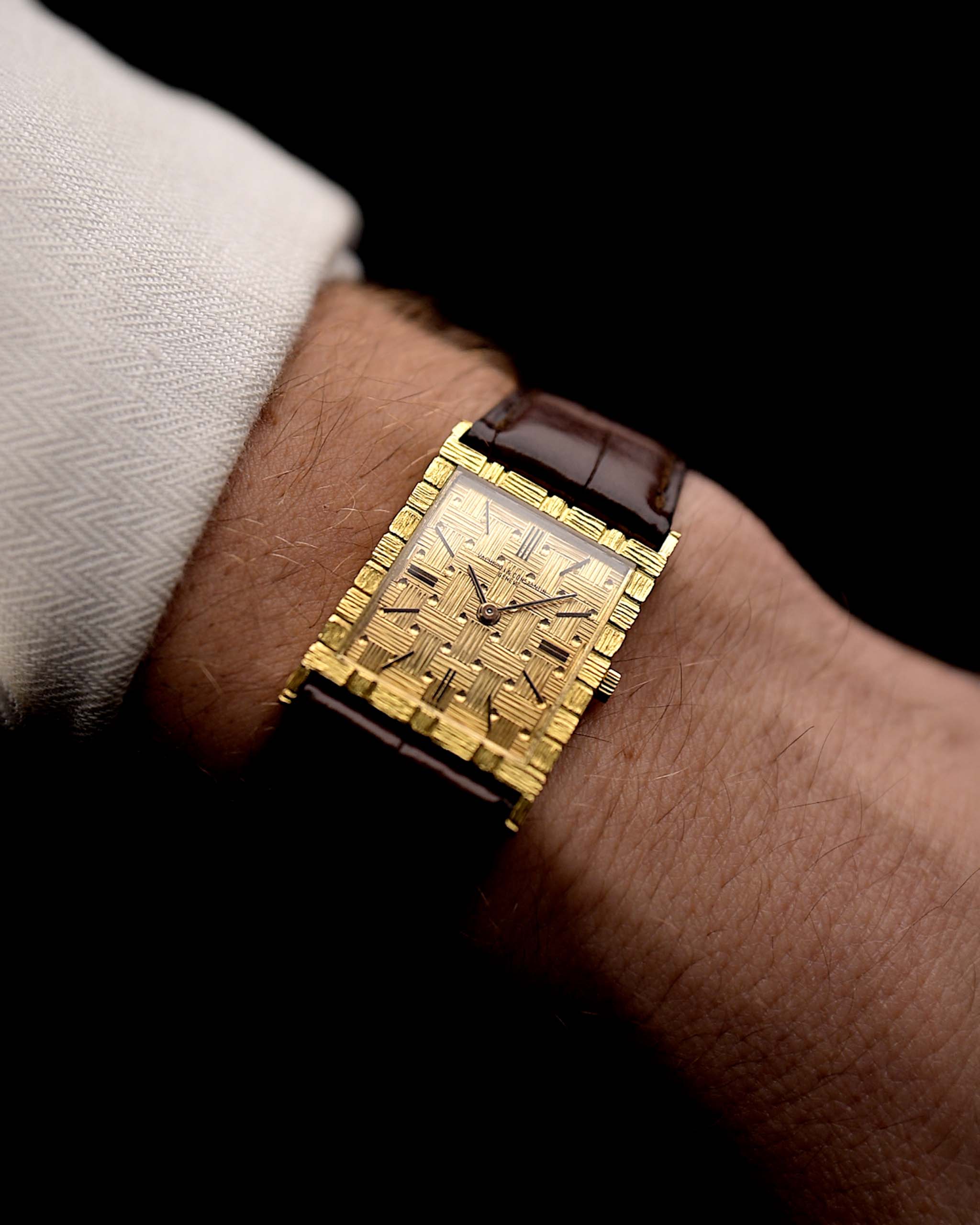Aquí tenemos un reloj de vestir Vacheron Constantin de oro amarillo de 18 quilates con un precioso acabado y un diseño de caja rectangular de los años setenta. Esta pieza en particular destaca por su acabado de cestería punzonada en toda la pieza, que hemos visto por primera vez. Es un verdadero buque insignia de la artesanía suiza de los años setenta.
