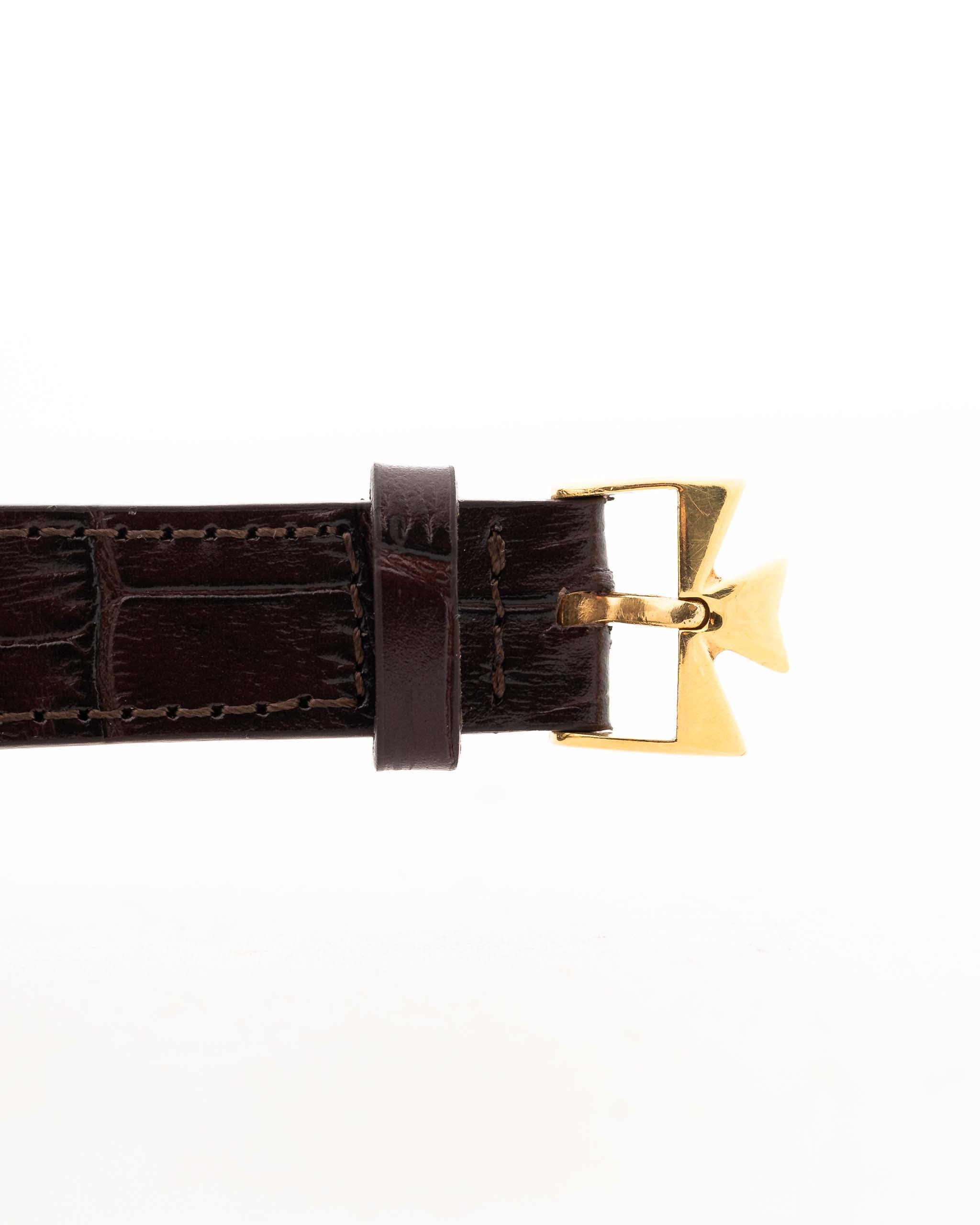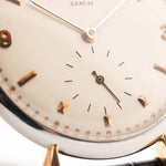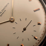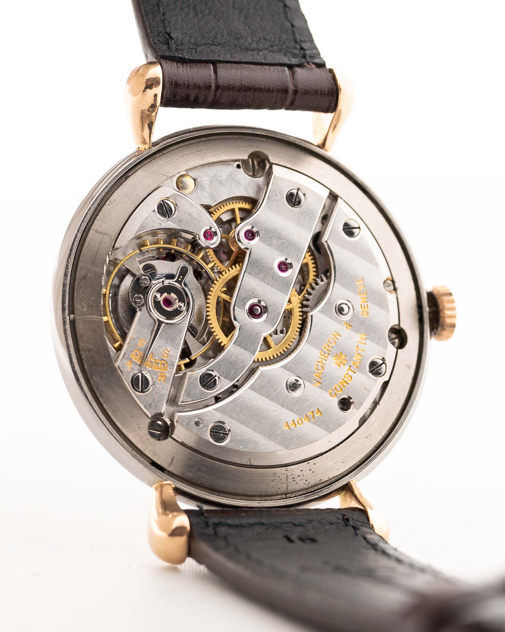 Un Vacheron Constantin de finales de la década de 1930 magníficamente conservado, que destaca por su excepcional caja bicolor: un cuerpo de acero inoxidable combinado con unas esculturales asas en forma de lágrima de oro rosa de 18 quilates. La esfera de esmalte plateado, que se conserva intacta, es una obra maestra de sutiles detalles, con índices de oro rosa, agujas a juego y una elegante escala de minutos exterior, una composición que irradia el refinamiento de antes de la guerra.
