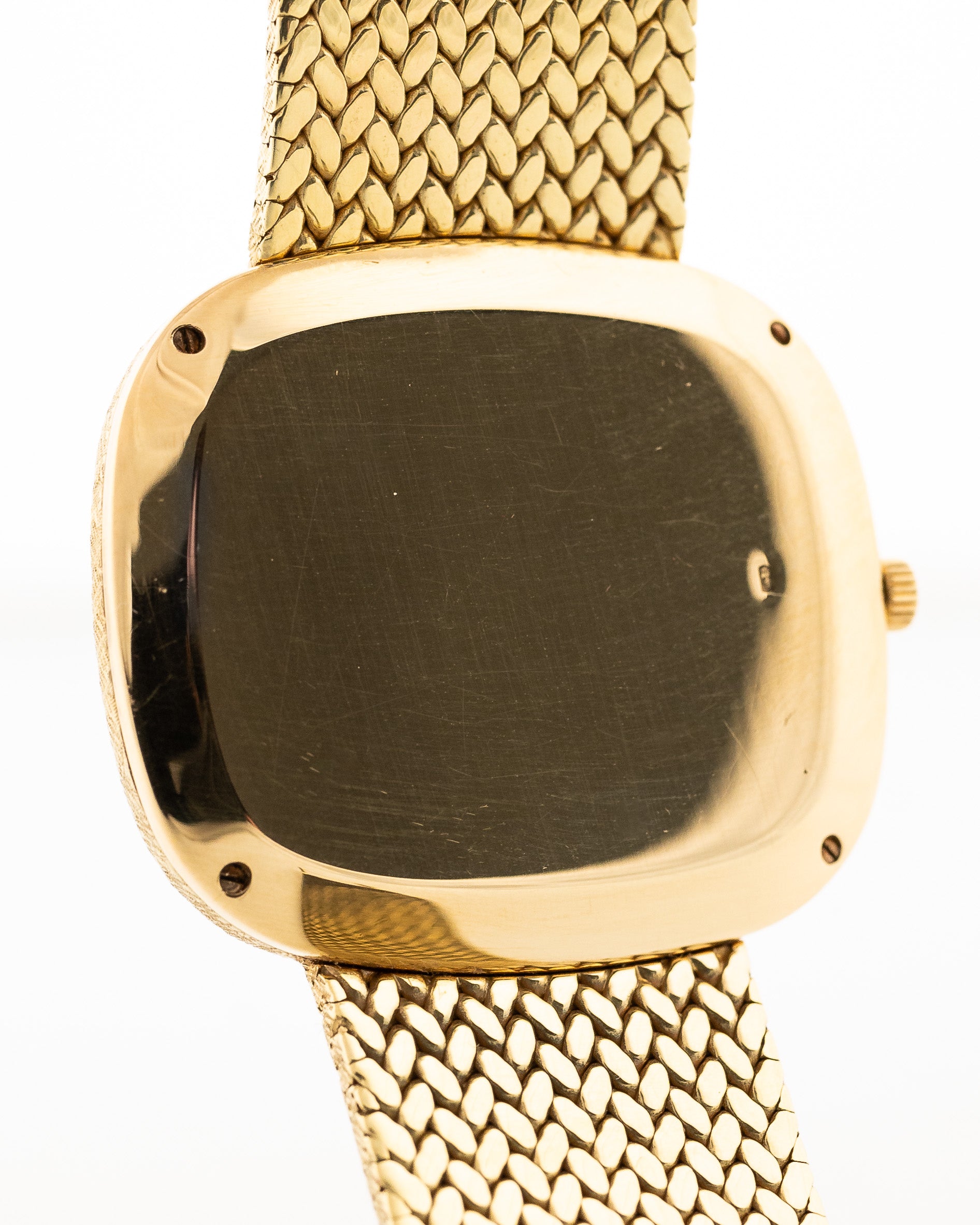 Aquí tenemos un precioso reloj de vestir Vacheron Constantin de oro amarillo de 18 quilates martillado de la década de 1970 con un impresionante brazalete tejido de oro amarillo macizo de 18 quilates.