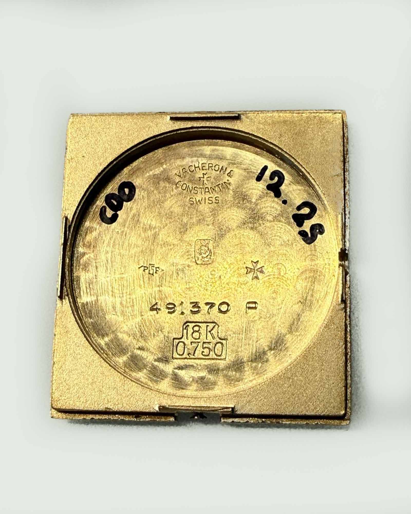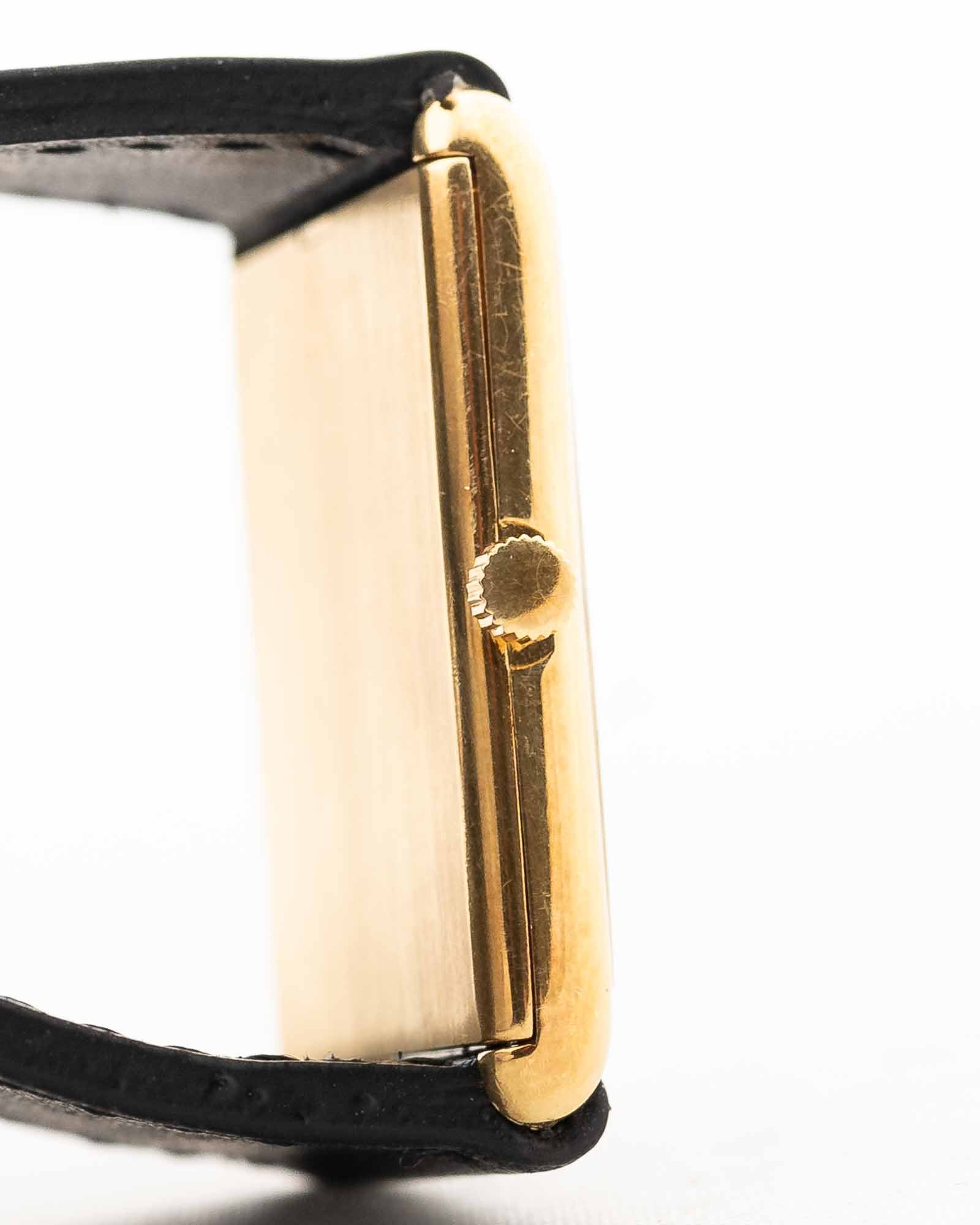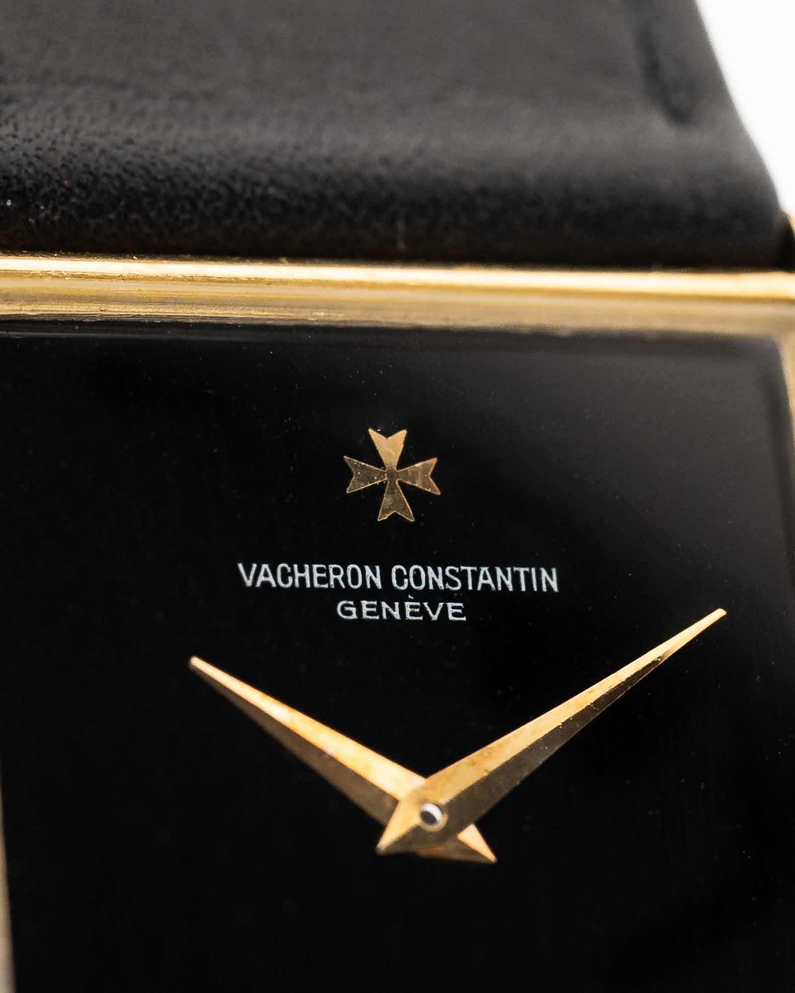 Un llamativo y poco común reloj de vestir Vacheron Constantin de la década de 1970, que se caracteriza por su elegante caja estilo Tank y su contraste puro y gráfico. Fabricado en oro amarillo macizo de 18 quilates, esta pieza se ve realzada por una impecable esfera de ónix negro, minimalista, atrevida y atemporal. Las agujas doradas dauphine y la nítida firma VC en blanco destacan maravillosamente sobre la superficie de color negro intenso, creando una presencia refinada pero poderosa.