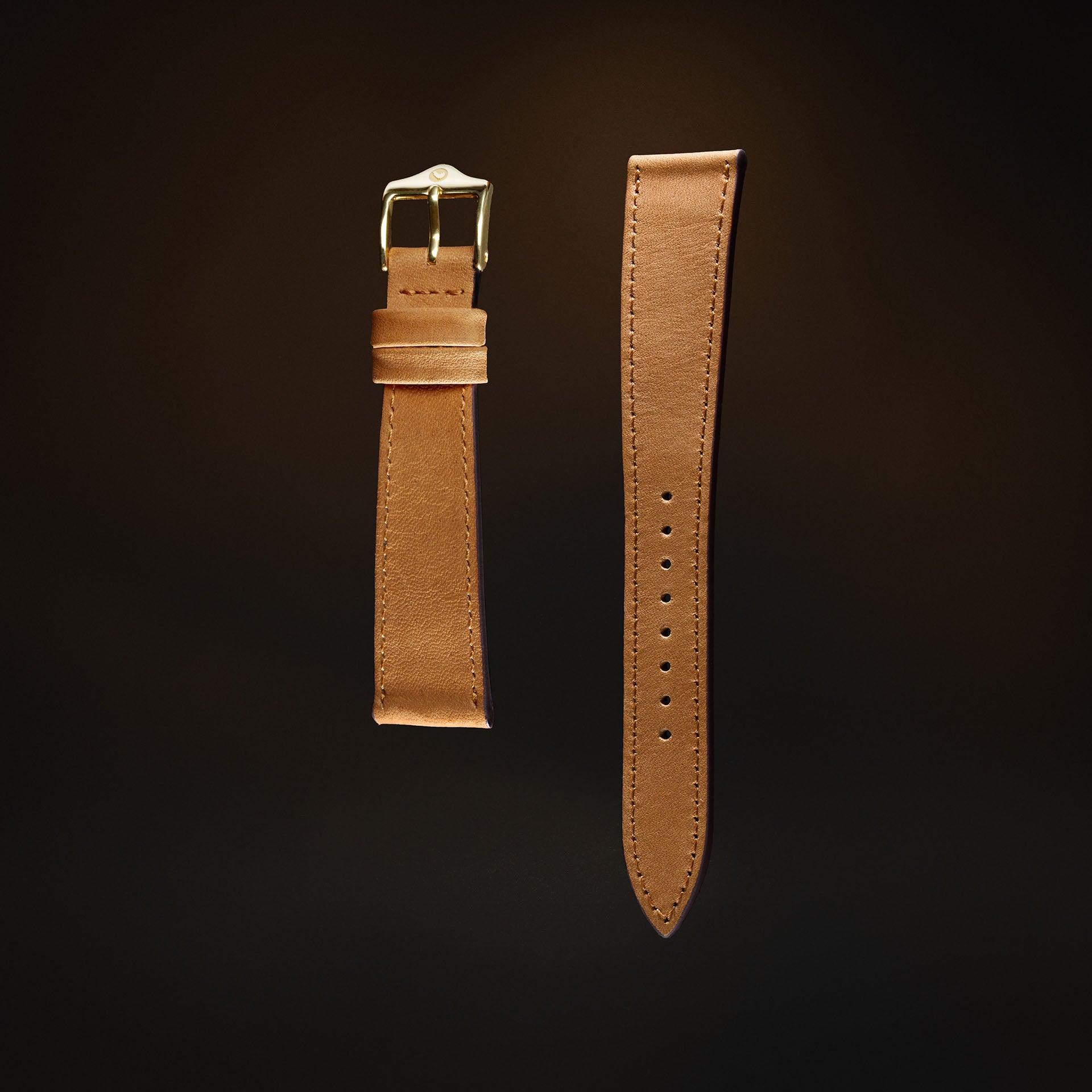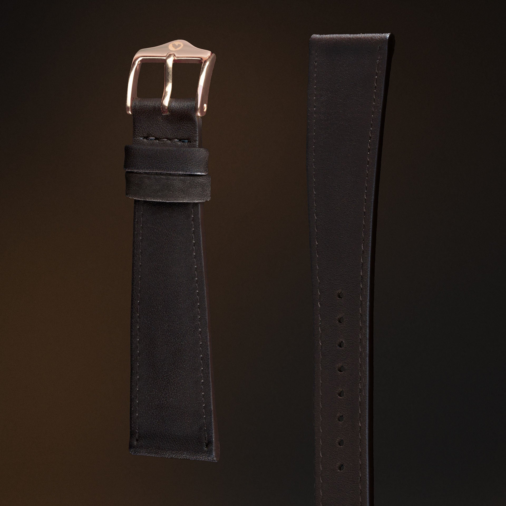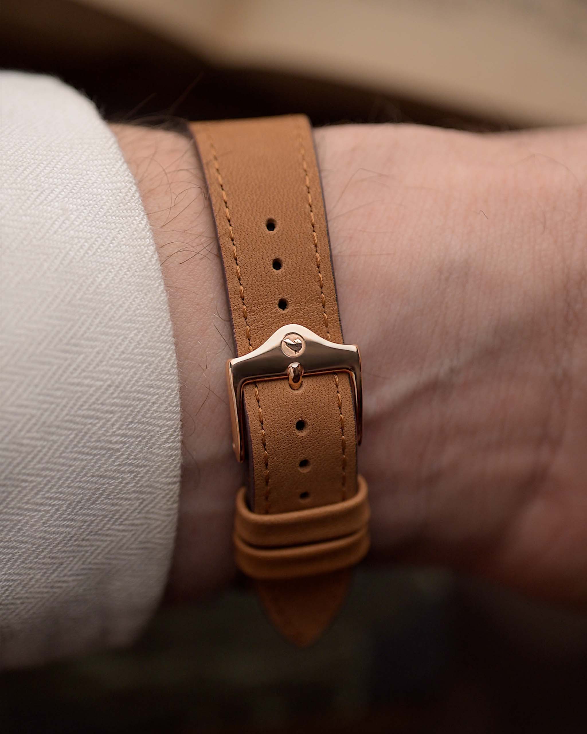 Fabriqué en cuir de veau allemand fin de 2 mm, le Kardinal est si doux qu'il épouse votre poignet dès le premier jour. La forme conique unique est un complément discret et constitue un cadre bien mérité pour votre Montre Vintage classique.