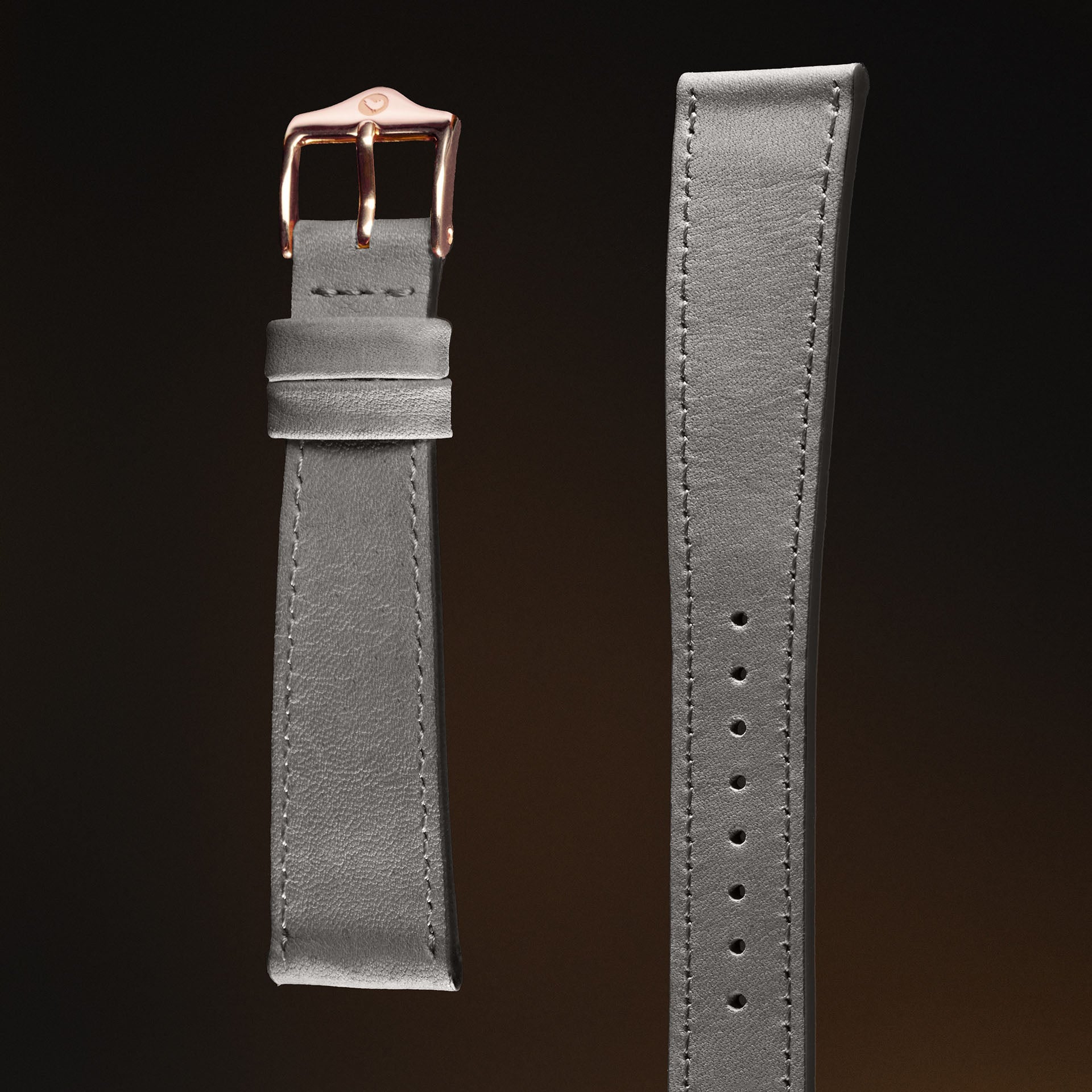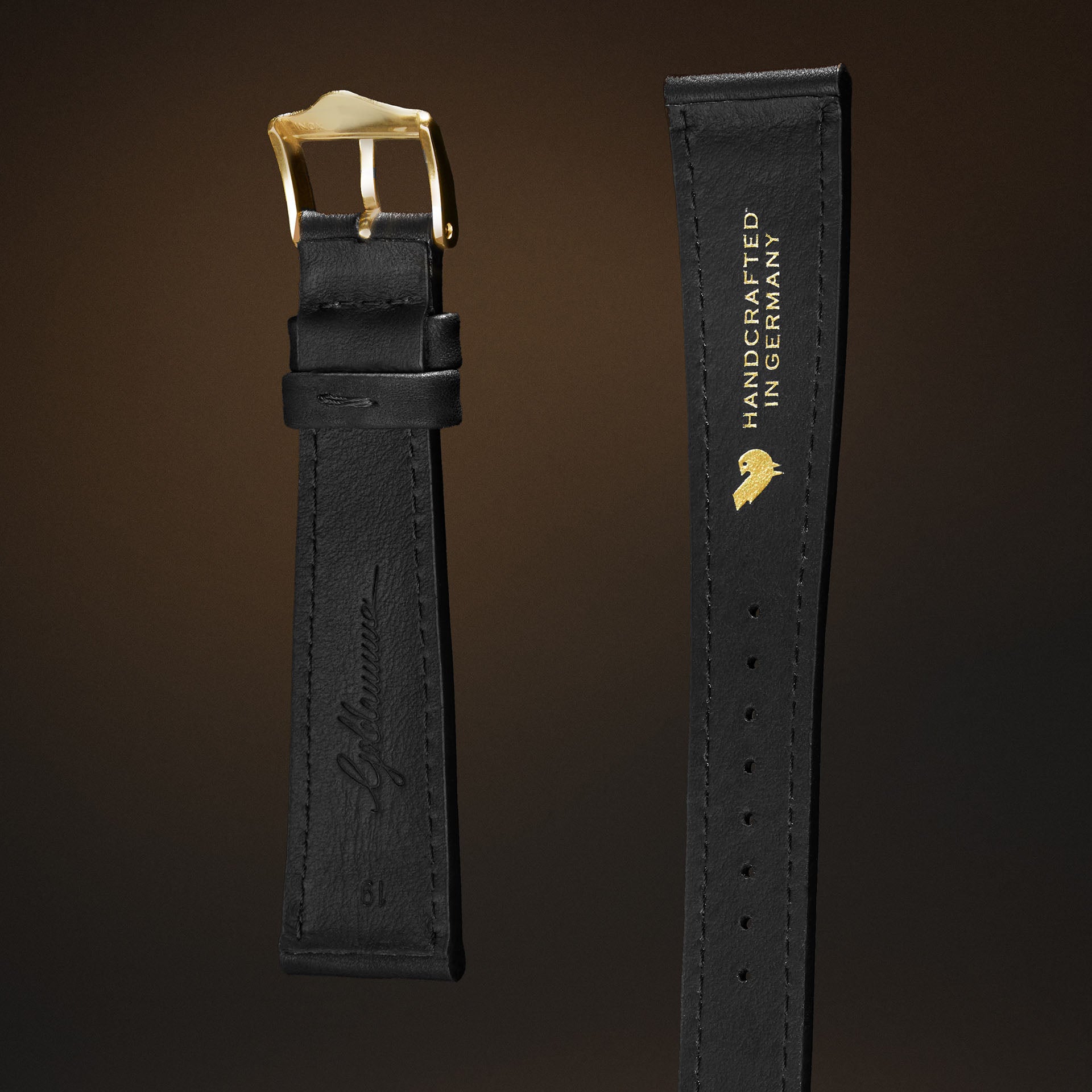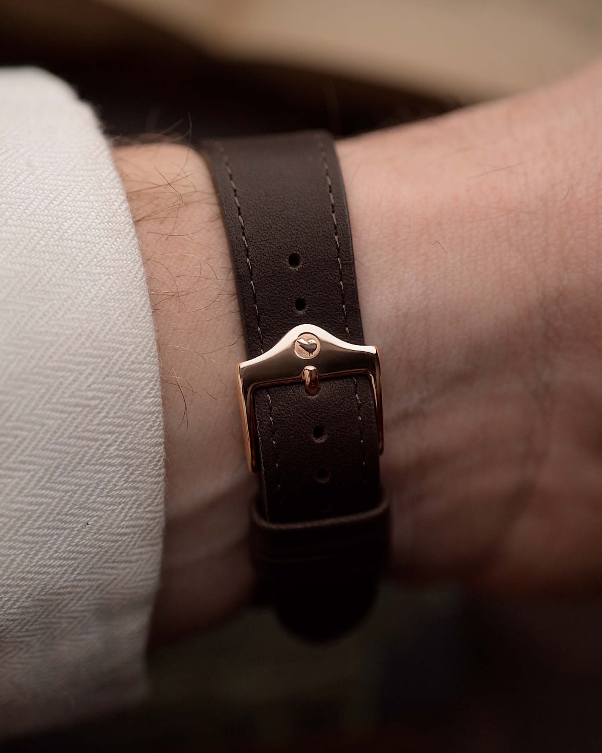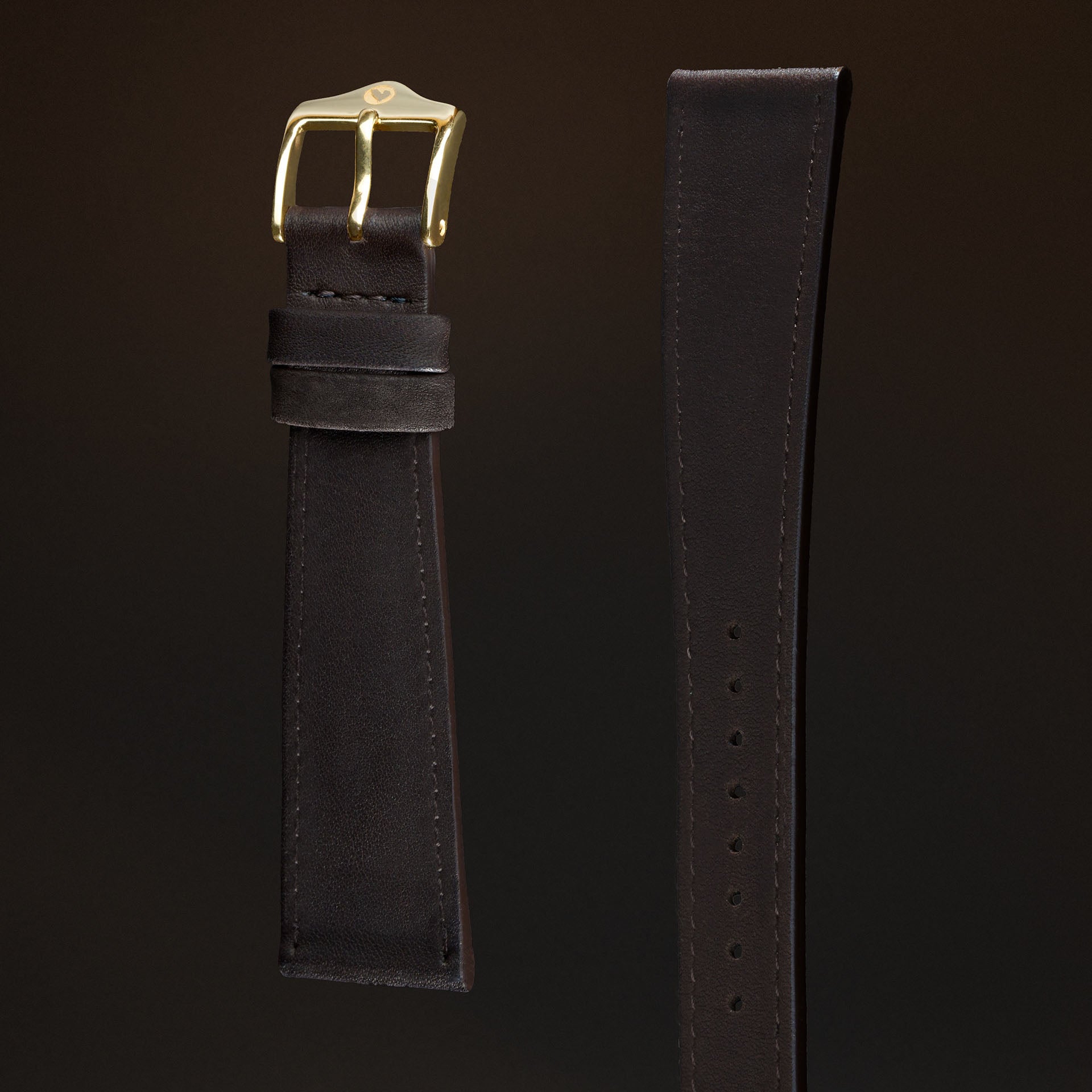Fabriqué en cuir de veau allemand fin de 2 mm, le Kardinal est si doux qu'il épouse votre poignet dès le premier jour. La forme conique unique est un complément discret et constitue un cadre bien mérité pour votre Montre Vintage classique.