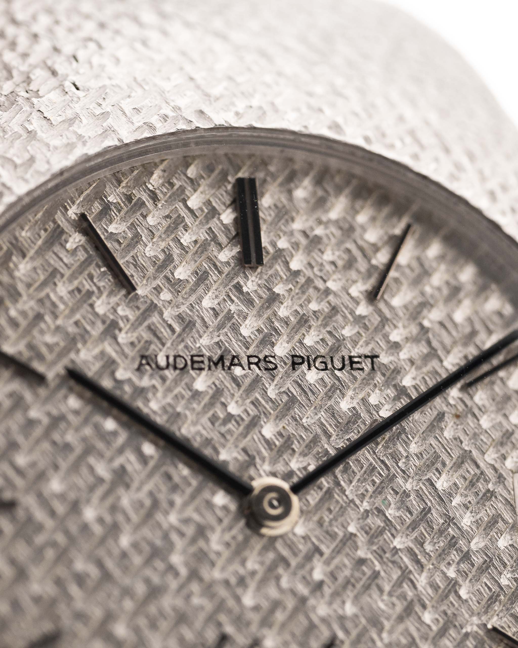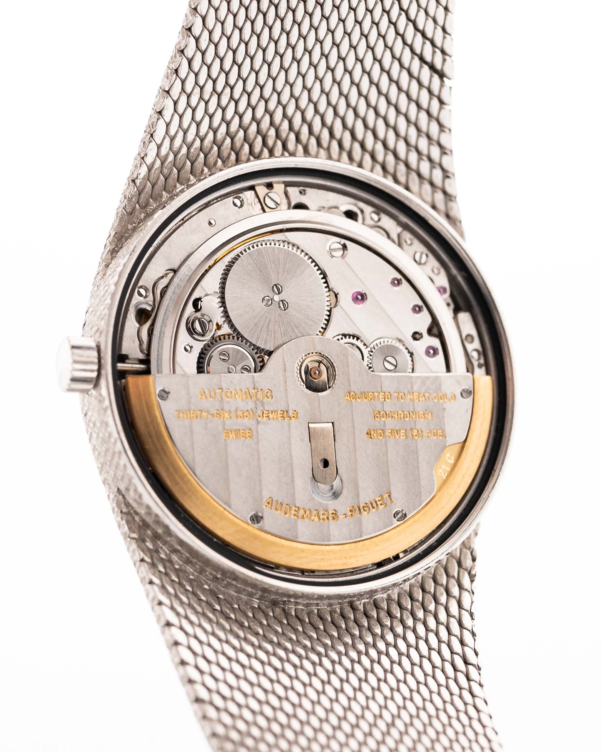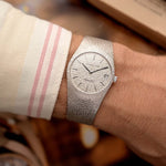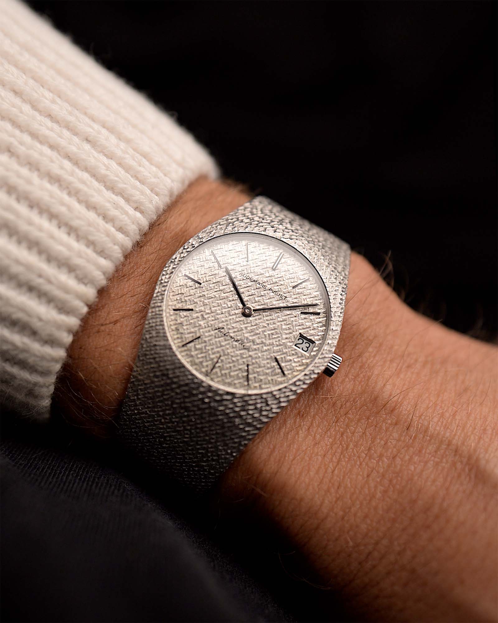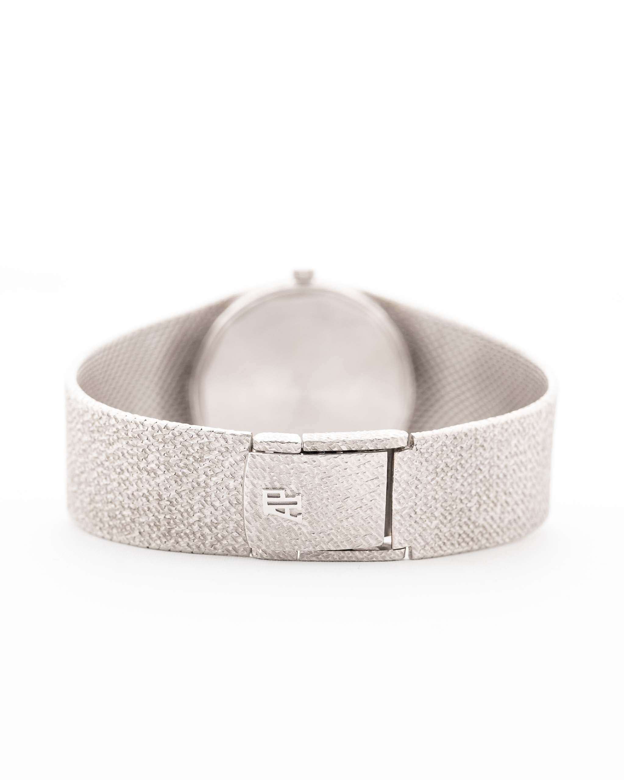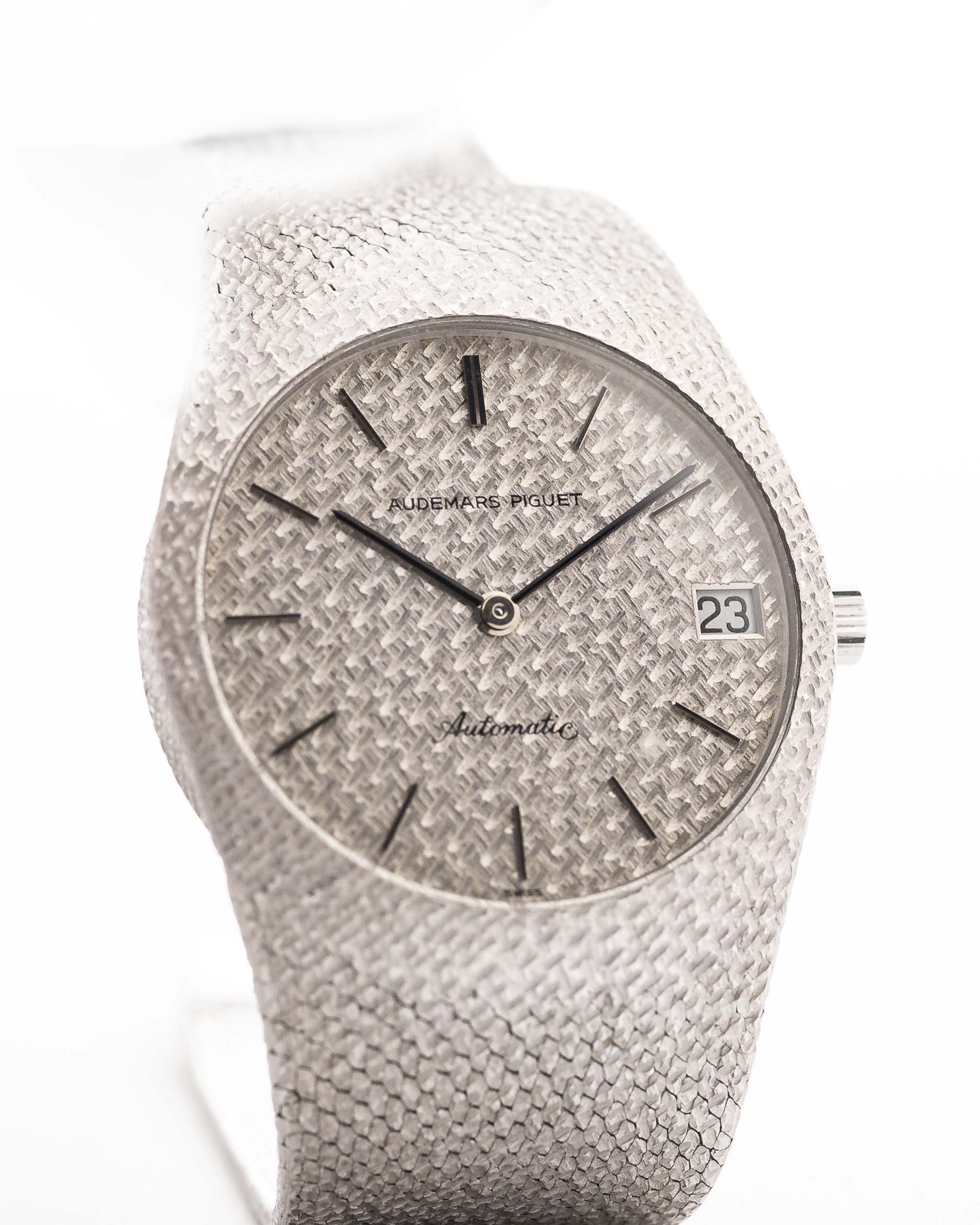 Mince, rare et indéniablement raffinée, cette montre habillée Audemars Piguet des années 1970 allie un design pur à une technique de mouvement révolutionnaire. Réalisée en or blanc 18 carats avec un bracelet intégré, elle incarne le luxe discret dans toute sa splendeur.