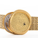 Le boîtier en or jaune 18 carats mesurant 31 mm de diamètre est en parfait état et raffiné avec un bracelet lisse et unique en or jaune et blanc 18 carats. La cerise sur le gâteau est le rare cadran argenté scintillant et la lunette au design assorti au bracelet.