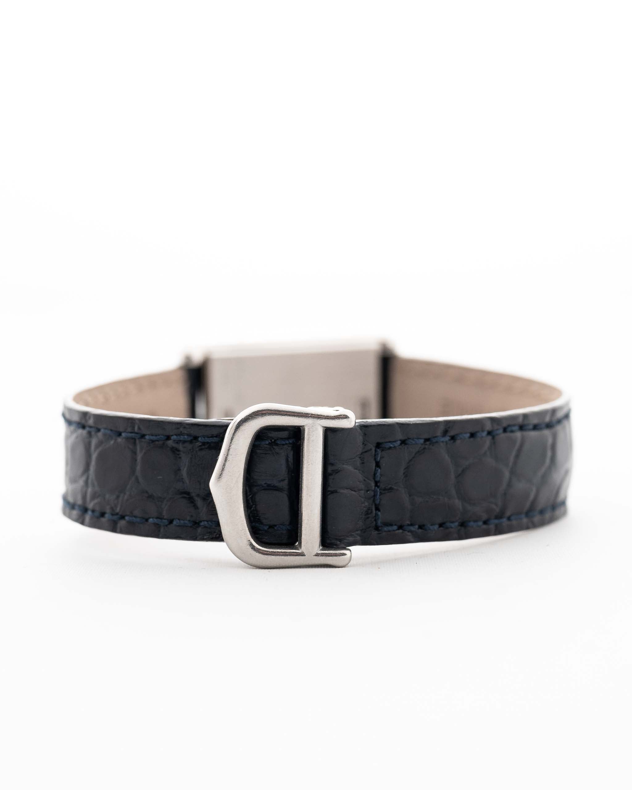The stainless steel case is slim, balanced, and unmistakably Cartier. Its white dial with blued sword hands and minimalist design speaks to refined taste, while the original blue Cartier leather strap and deployant clasp complete the signature look.