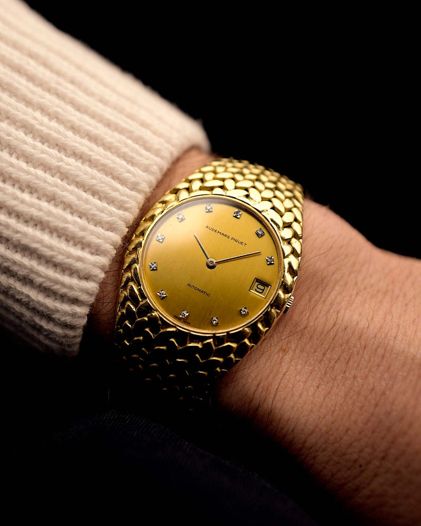 Montre Vintage classique portée au poignet au-dessus de Montres Vintage et de montres de luxe sur un bureau.