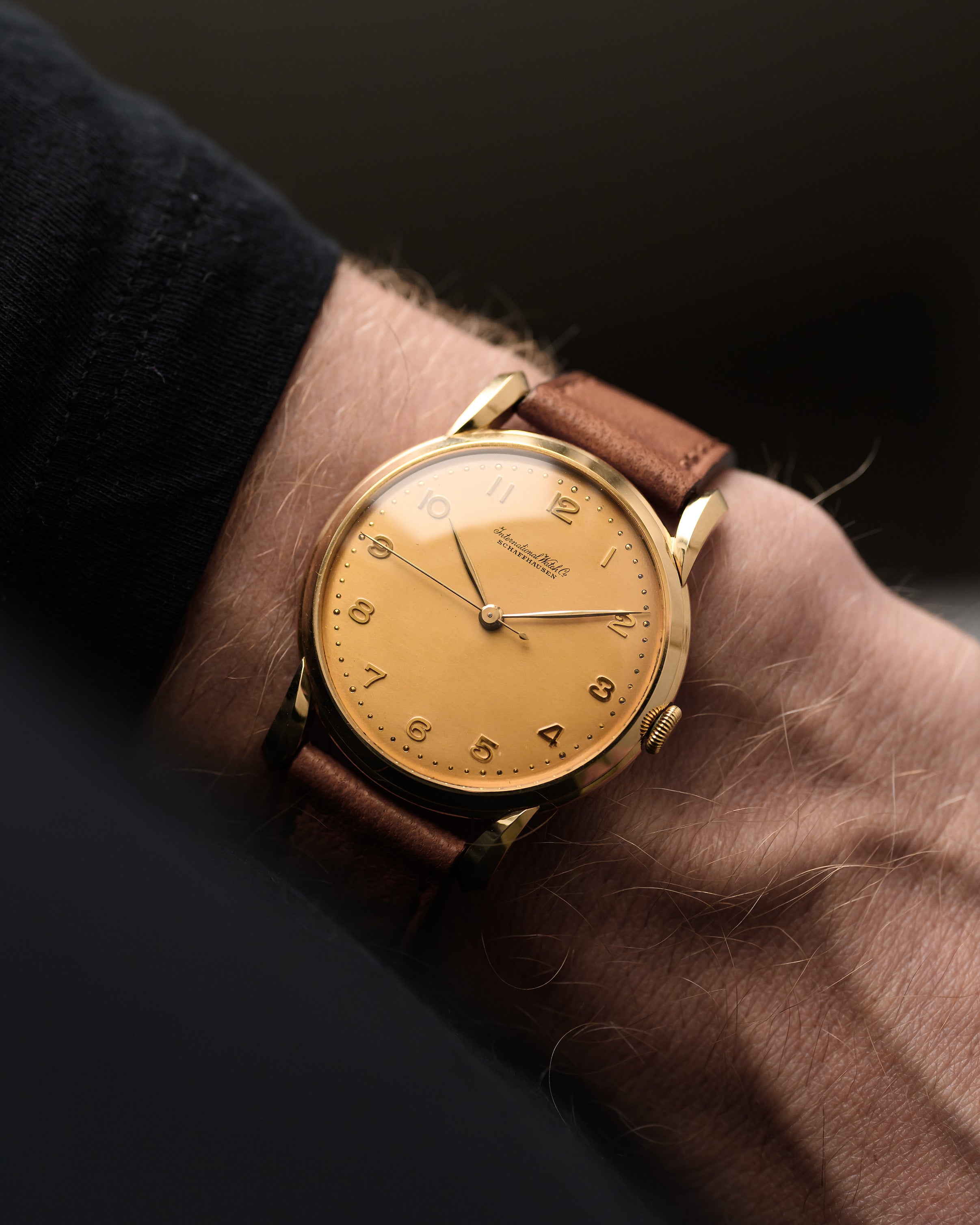 IWC a produit très tôt une très grande variété de montres-bracelets, allant des montres habillées aux montres d'aviation. Cet exemple, en or jaune 18 carats, de style Calatrava avec des cornes bombées, restera une constante dans les collections, d'autant plus qu'il se présente dans un état nos exceptionnel.