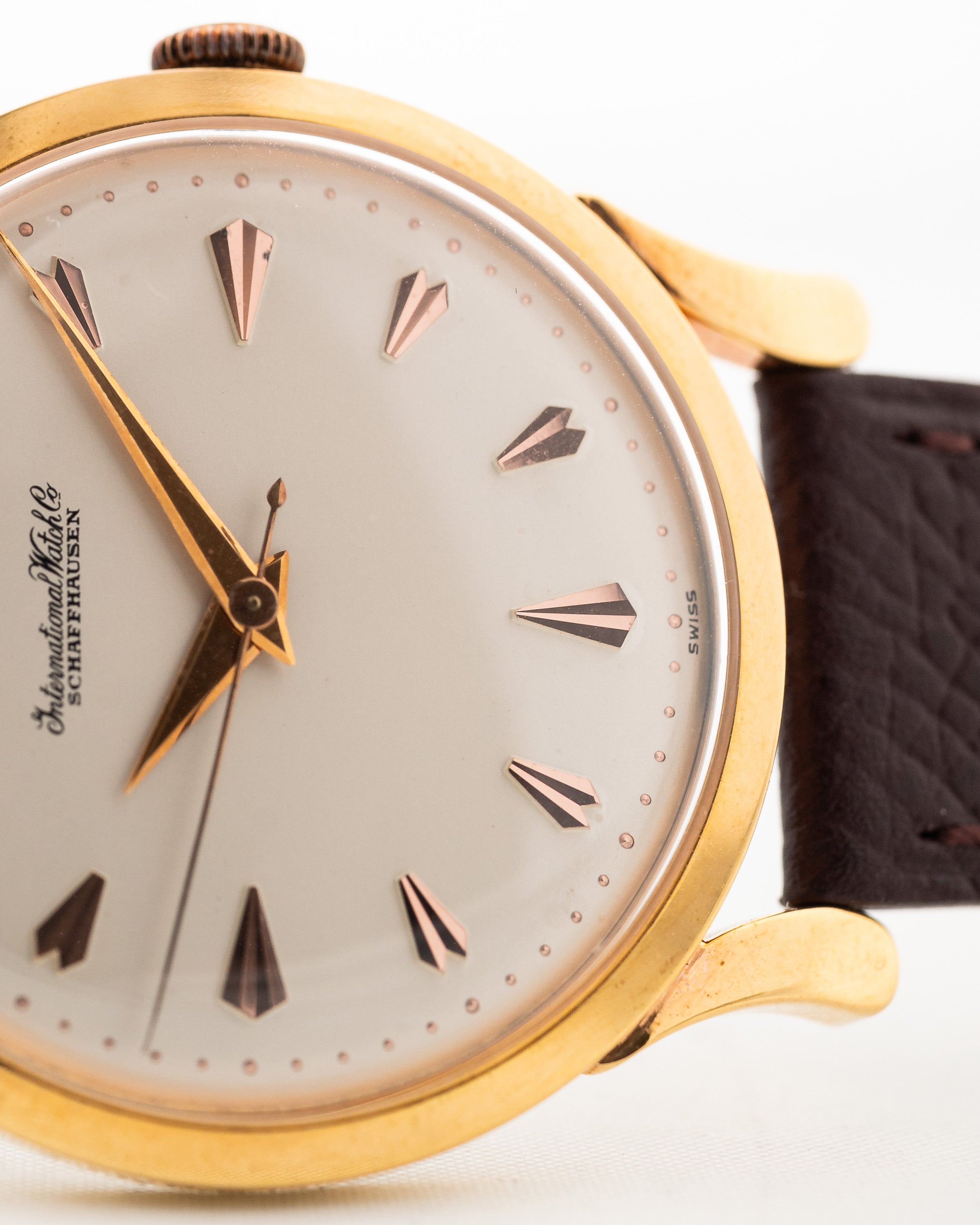 IWC a produit très tôt une très grande variété de montres-bracelets, allant des montres habillées aux montres d'aviation. Cet exemple, en acier plaqué or rose, de style Calatrava avec des cornes très uniques, restera une constante dans les collections, d'autant plus qu'il est dans un état exceptionnel avec de magnifiques et très rares index Arrow.