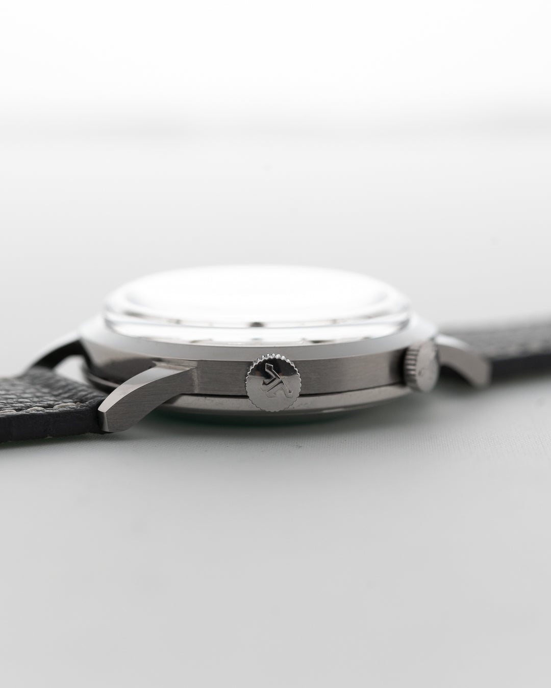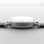 Cet exemple est la version automatique à pare-chocs de 1958 et présente un énorme boîtier de 37 mm et un cadran argenté épuré avec des aiguilles et des index en acier et un guichet de date bien intégré.