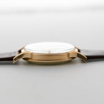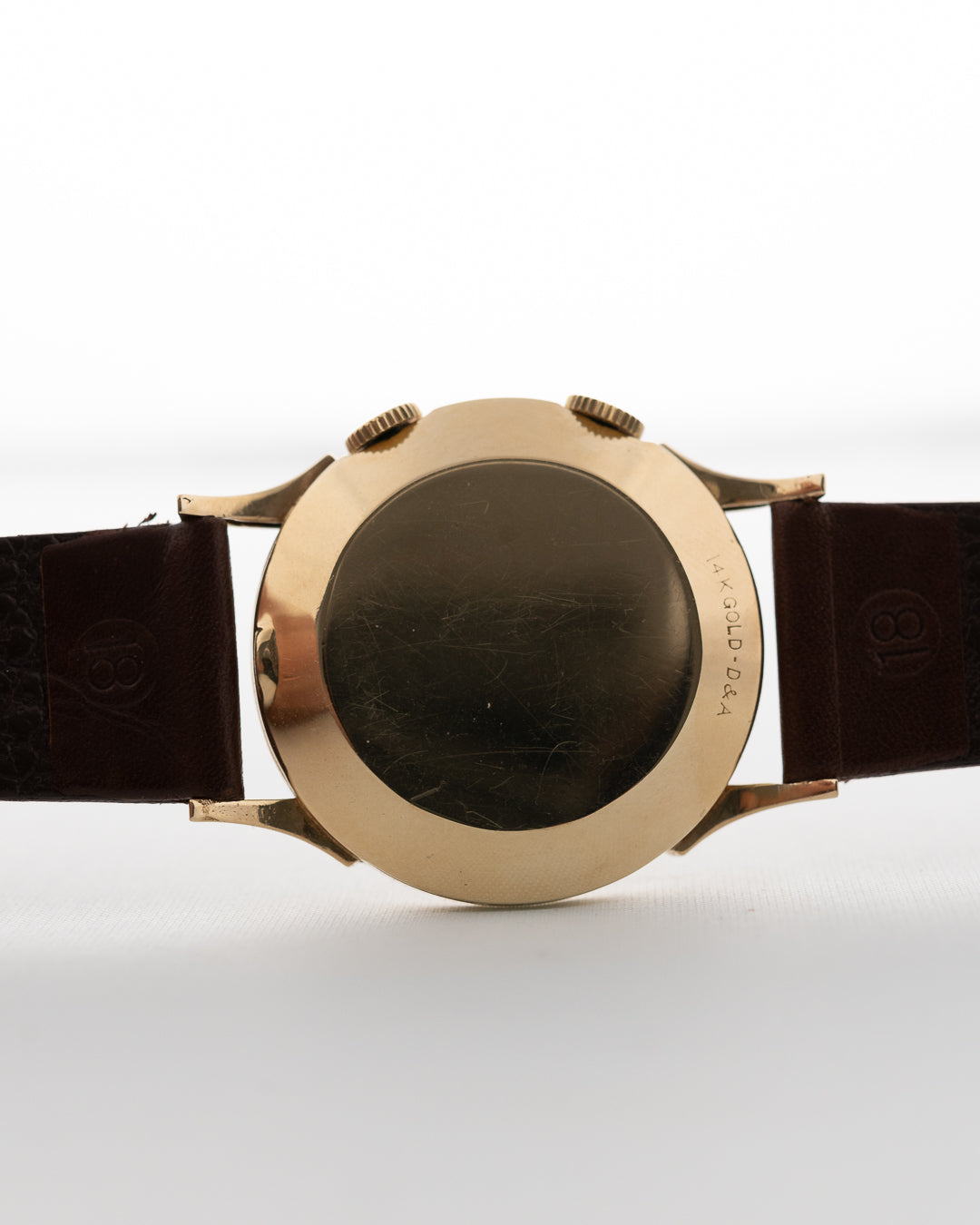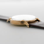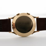 Cet exemple est la version à remontage manuel de 1951 et se caractérise par un design épuré sans date, un très bel anneau de chapitre en or et un superbe boîtier en or jaune avec de magnifiques attaches araignées.