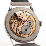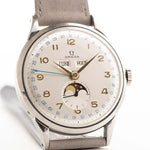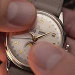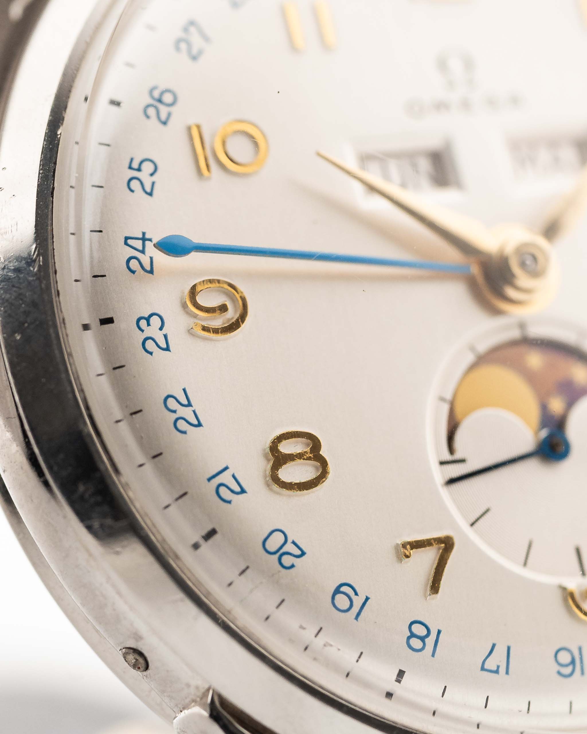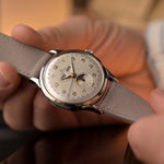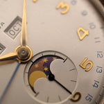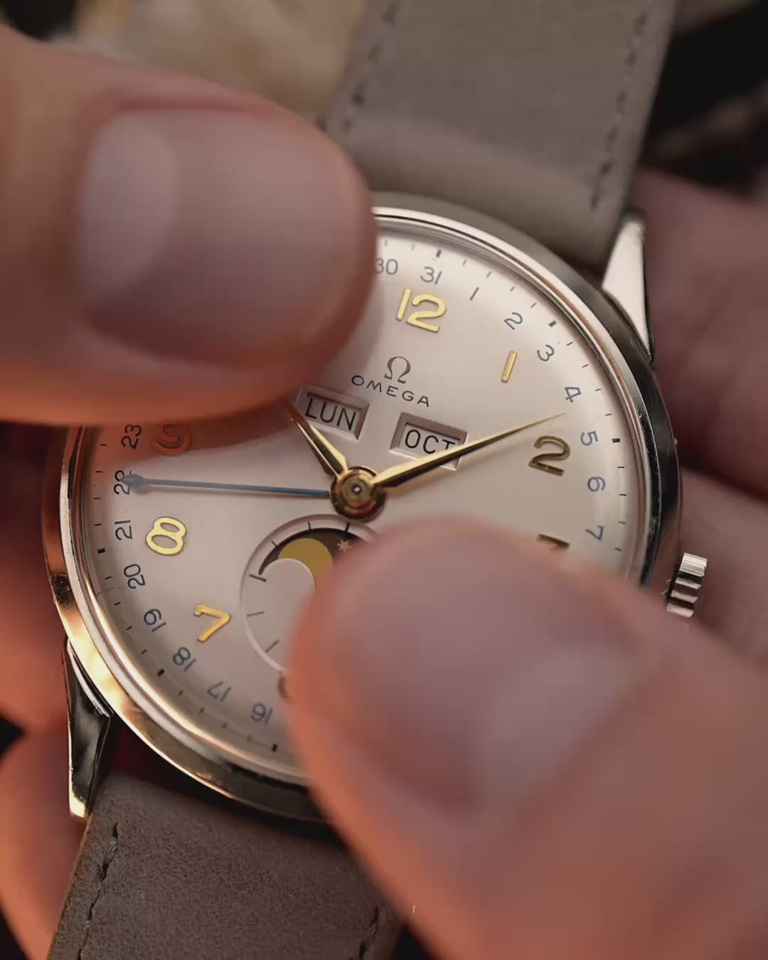 L'Omega Cosmic a été lancée en 1947 comme le modèle le plus prestigieux du catalogue d'Omega d'après-guerre, et cette référence 2486en démontre clairement la raison. Logée dans un boîtier rare en acier inoxydable de 37 mm, elle est dotée d'un calendrier complet avec complication phase de lune.