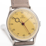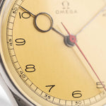 Le cadran doré brossé présente d'étonnants chiffres arabes Art déco, associés à d'élégantes aiguilles des heures Pontife - une combinaison rare et élégante qui distingue cette pièce. Logée dans un généreux boîtier en acier inoxydable de 32,5 mm (surdimensionné pour l'époque), cette Omega vintage fait, aujourd'hui encore, une impression de confiance au poignet.