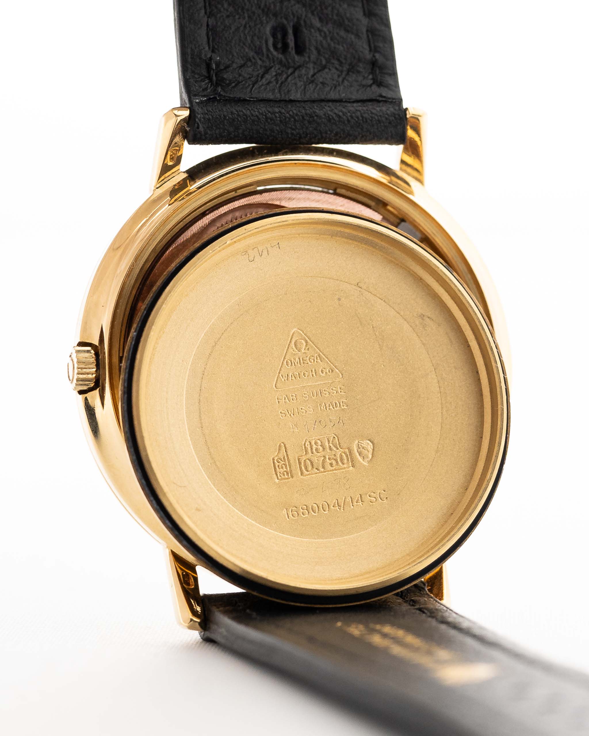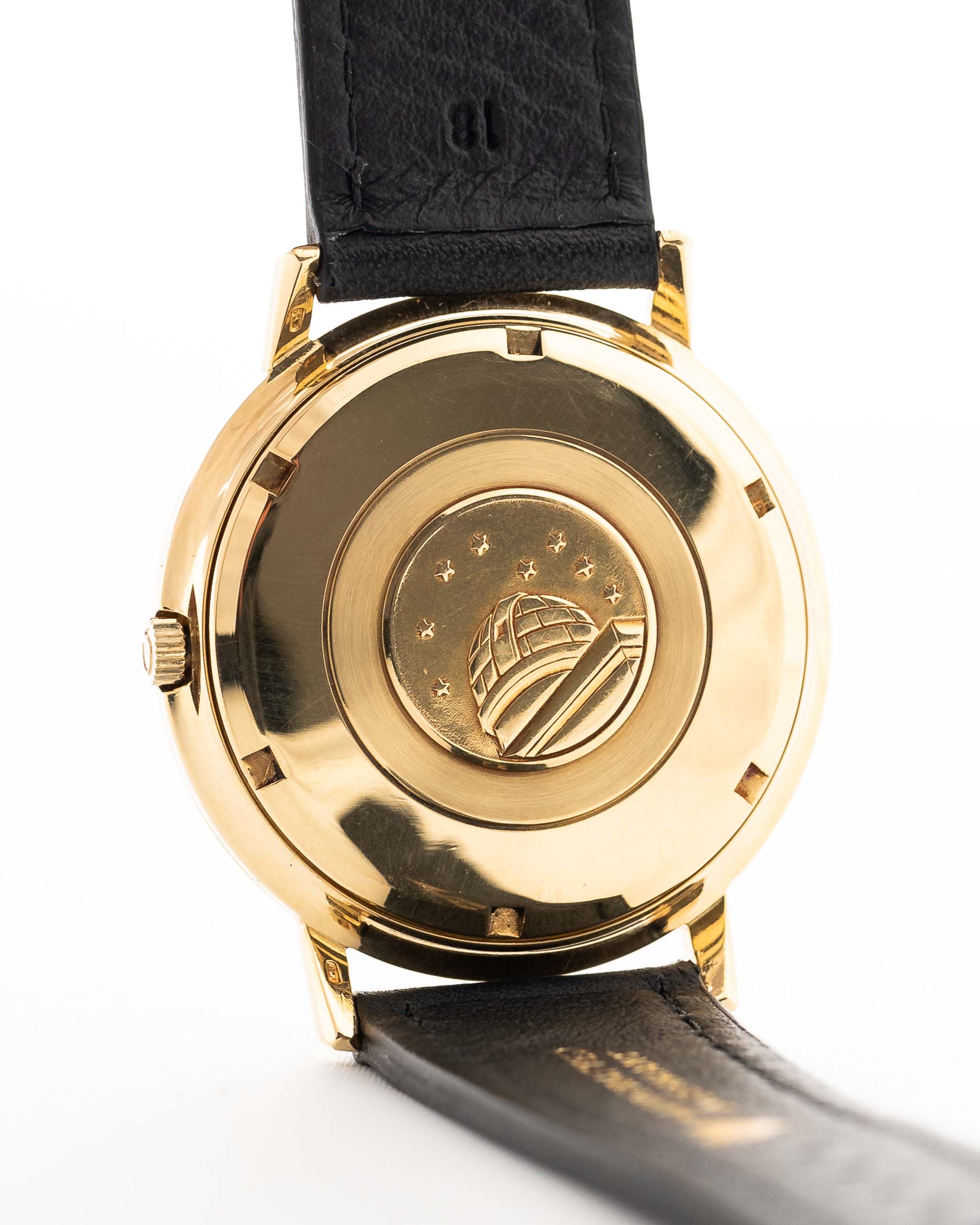 Montre Omega Constellation 168004 Onyx 18k de 1963. 35.5mm avec boîtier en or jaune 18k, Calibre chronomètre automatique 561, cadran doré impeccable et bracelet en cuir.