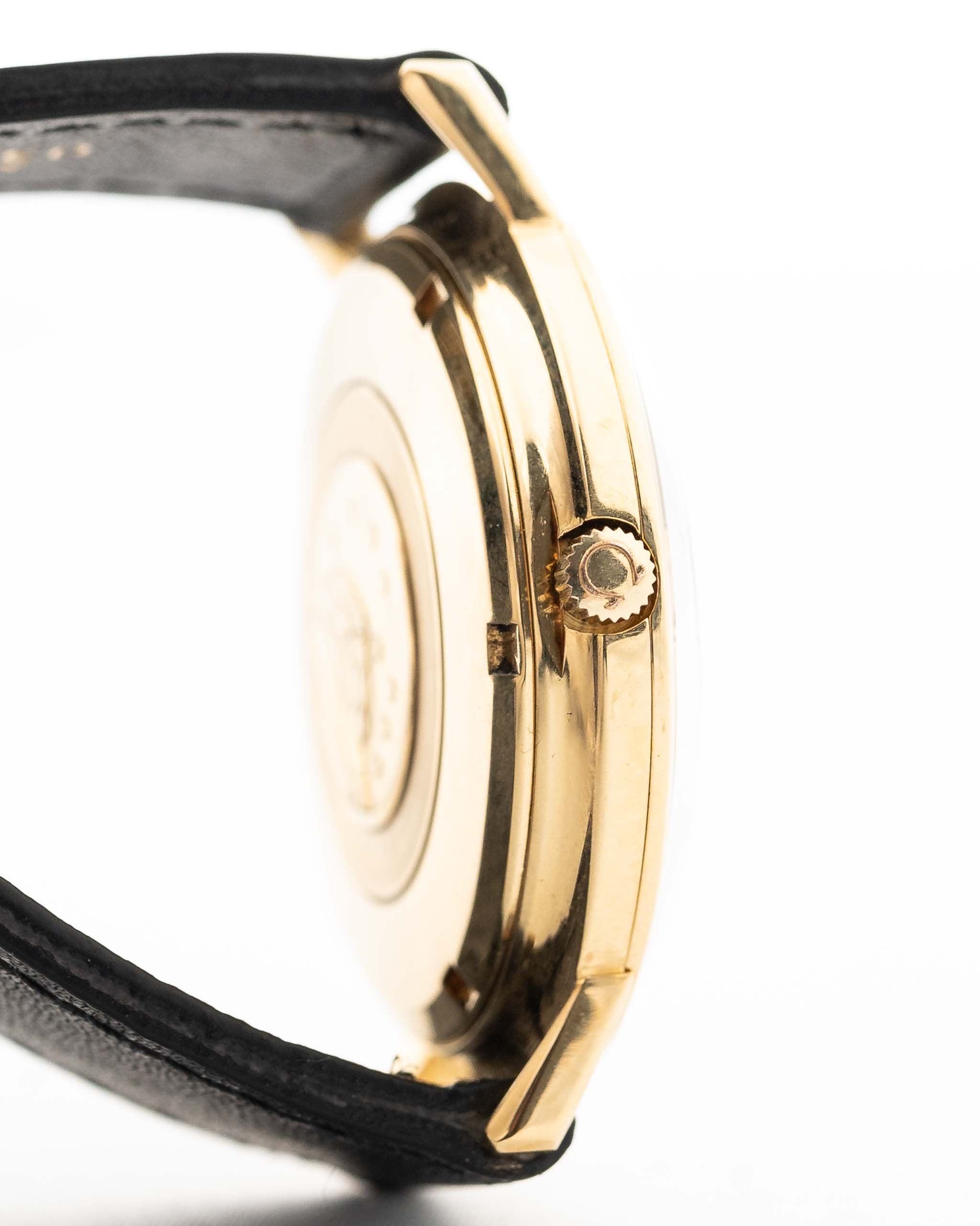 En son cœur se trouve l'emblématique cadran pie sunburst doré, rehaussé par de rares index bâtons minces avec incrustations d'onyx noir - un élément de design très recherché par les collectionneurs. Les aiguilles dauphine d'origine, la disposition en croix et le calibre 561 certifié chronomètre complètent cette beauté mécanique au pedigree impeccable.