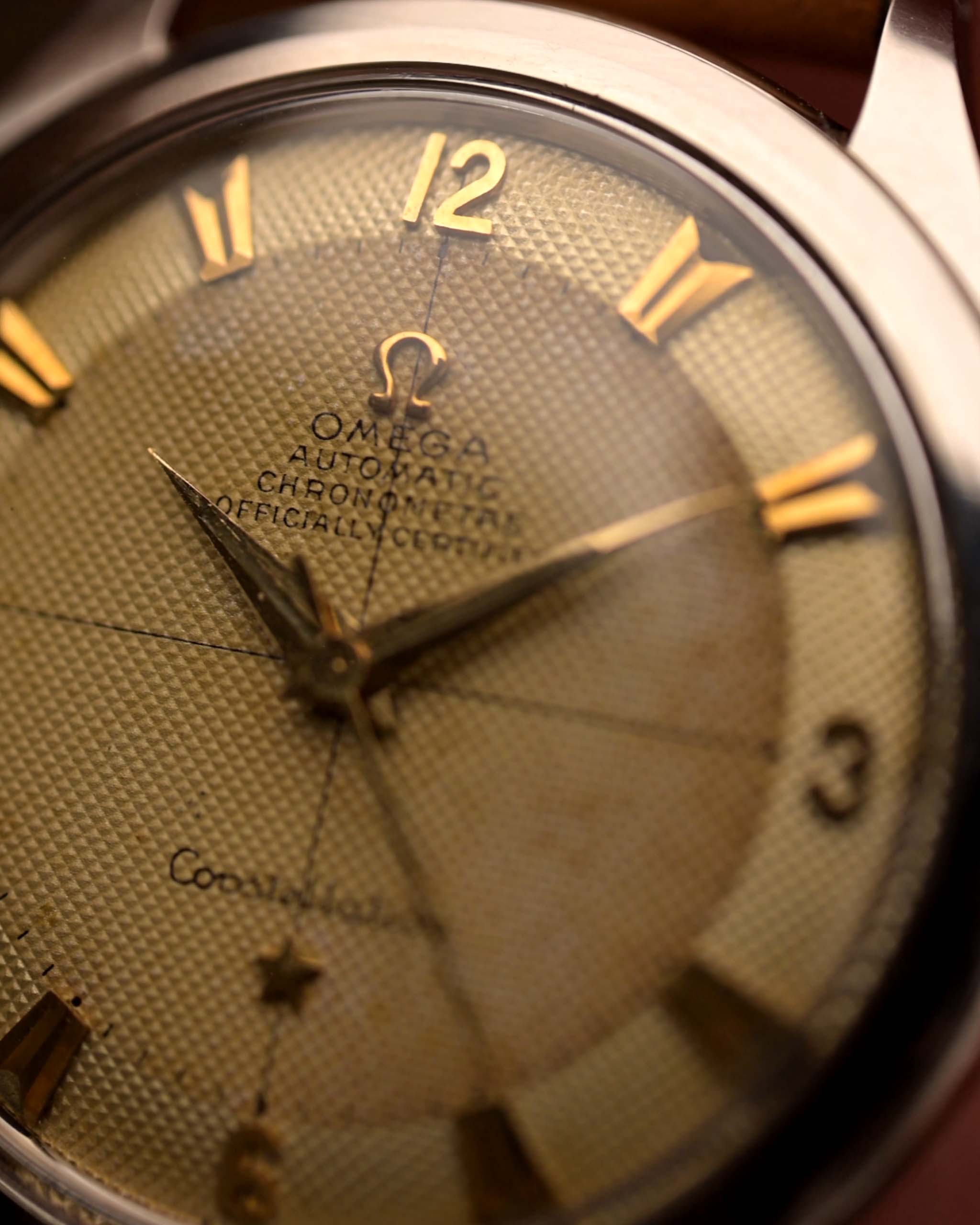 Une Omega Constellation véritablement exceptionnelle datant de 1952, qui marque les débuts de la légendaire gamme de chronomètres Omega. Logée dans un boîtier en acier inoxydable de 35 mm, cette pièce ancienne présente un cadran rare à double couleur en nid d'abeille, associé à d'élégants index en or, une configuration rarement observée de nos jours.