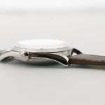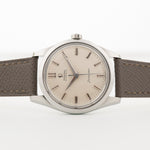 Voici une fascinante et rare Seamaster fabriquée par Omega en 1958. Elle est dotée d'un boîtier en acier inoxydable de 35 mm avec de très belles cornes tournées vers le bas, que l'on ne trouve habituellement que dans les boîtiers beaucoup plus volumineux. Elle est également dotée d'un beau cadran épuré et d'index bâtons.