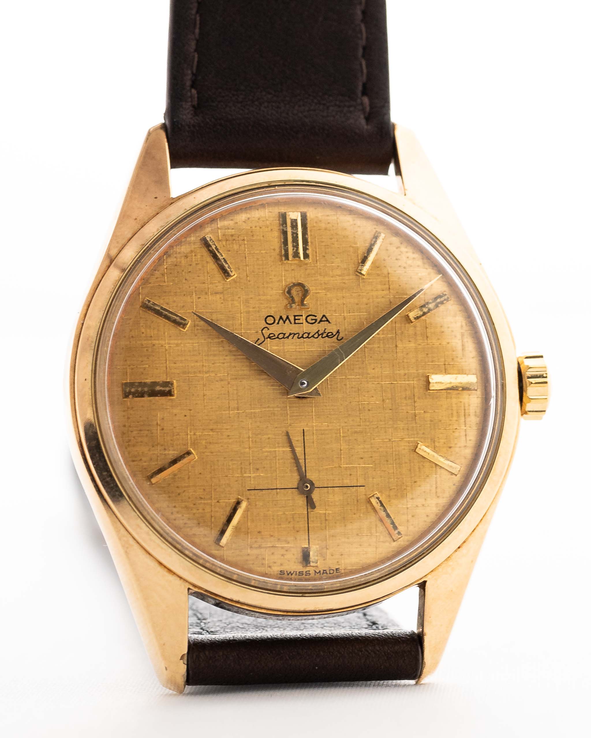 This Omega Seamaster Ref. 2990-1 from 1958 pairs timeless mid-century elegance with rare dial texture and presence. The 36 mm gold-plated case wears large for the era, enhanced by its clean proportions and slightly downturned lugs.