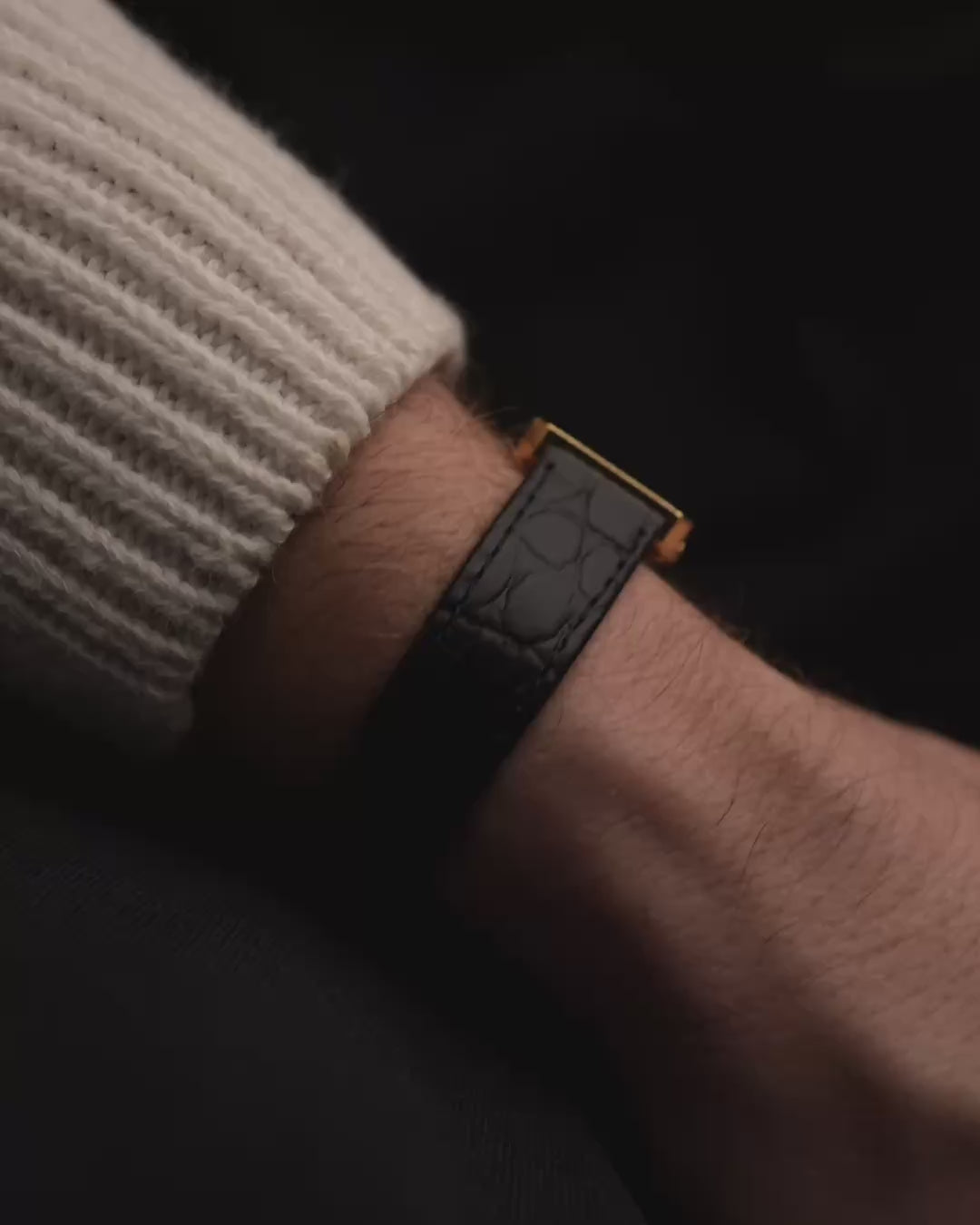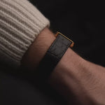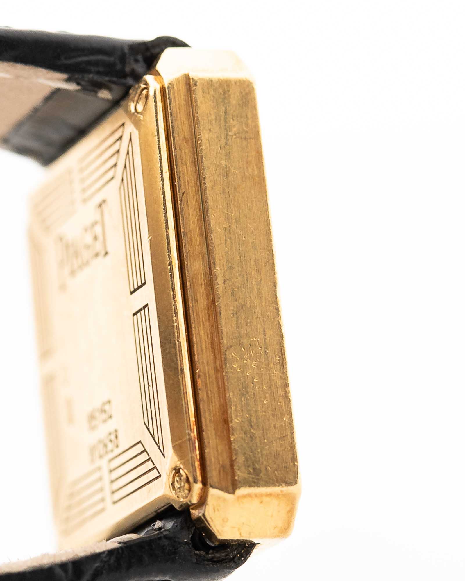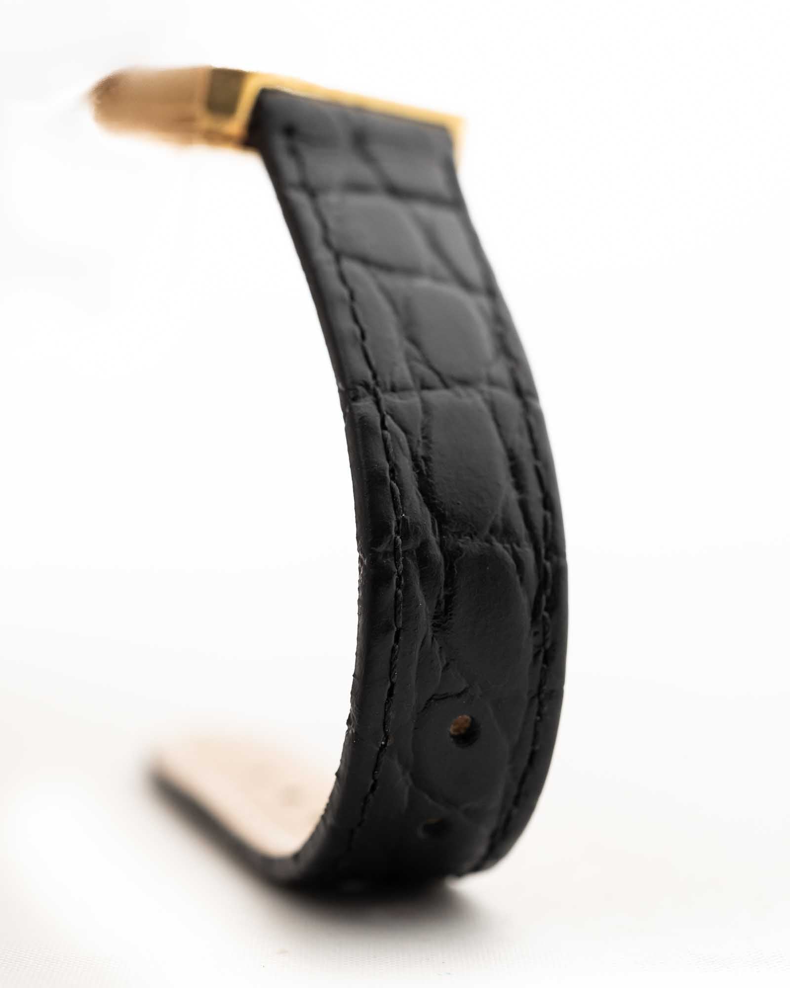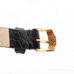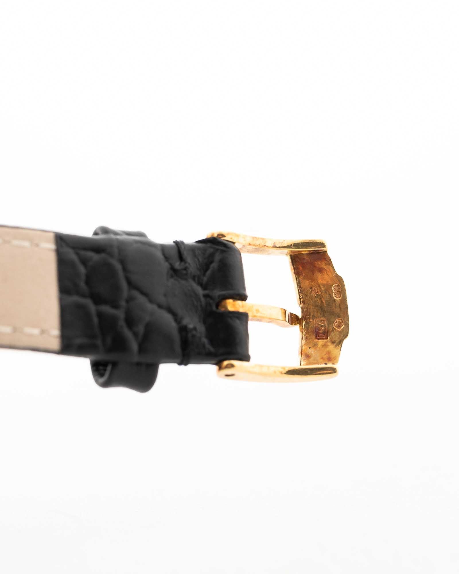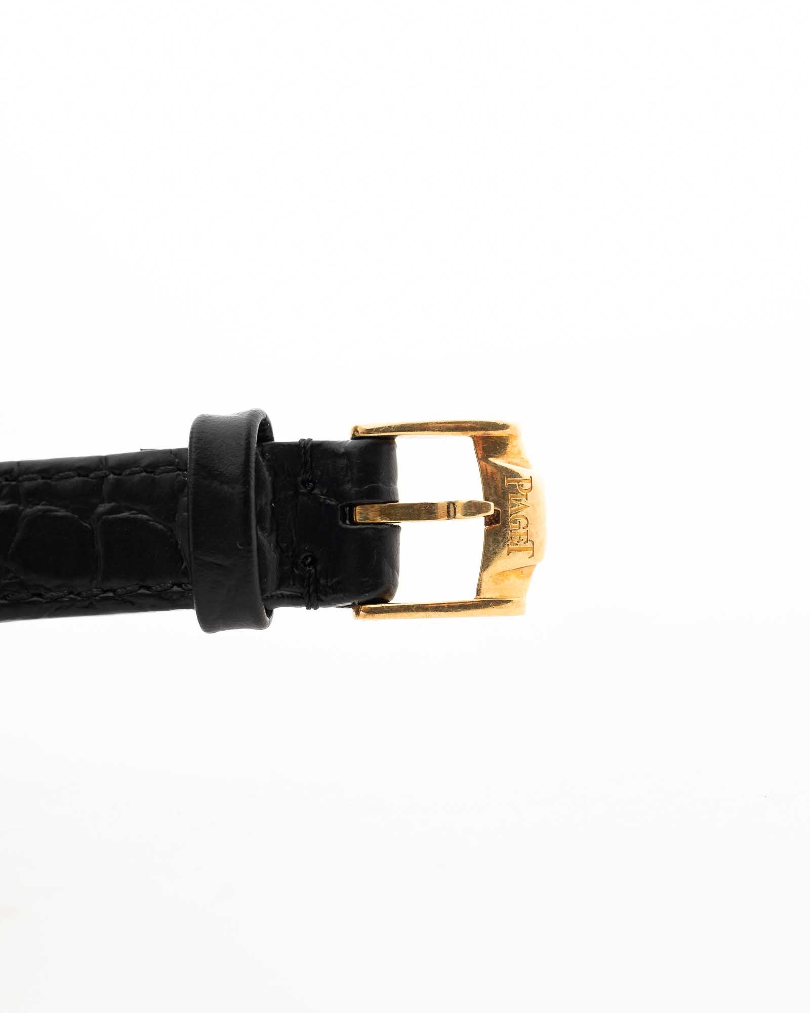 Elle est équipée d'un bracelet en cuir noir et d'une boucle originale Piaget en or 18 carats, finement poinçonnée et gravée du logo Piaget, un détail discret qui reflète les normes rigoureuses de la maison.
