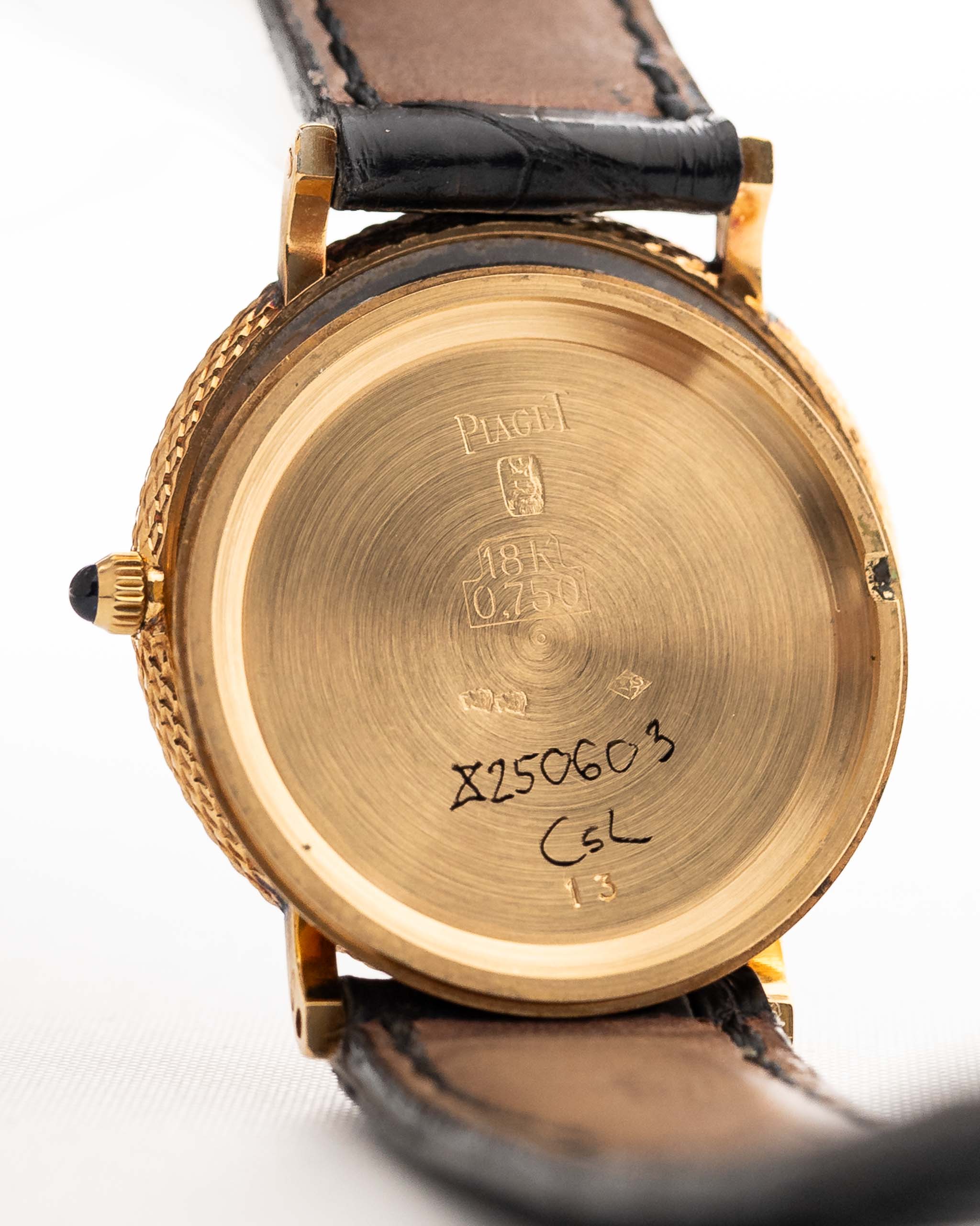 Une couronne en cabochon bleu, des aiguilles en forme de feuille noire et une boucle Piaget originale en 18 carats complètent l'ensemble. C'est le luxe suisse des années 1980 à l 'état pur - sobre, délibéré et éternellement élégant.