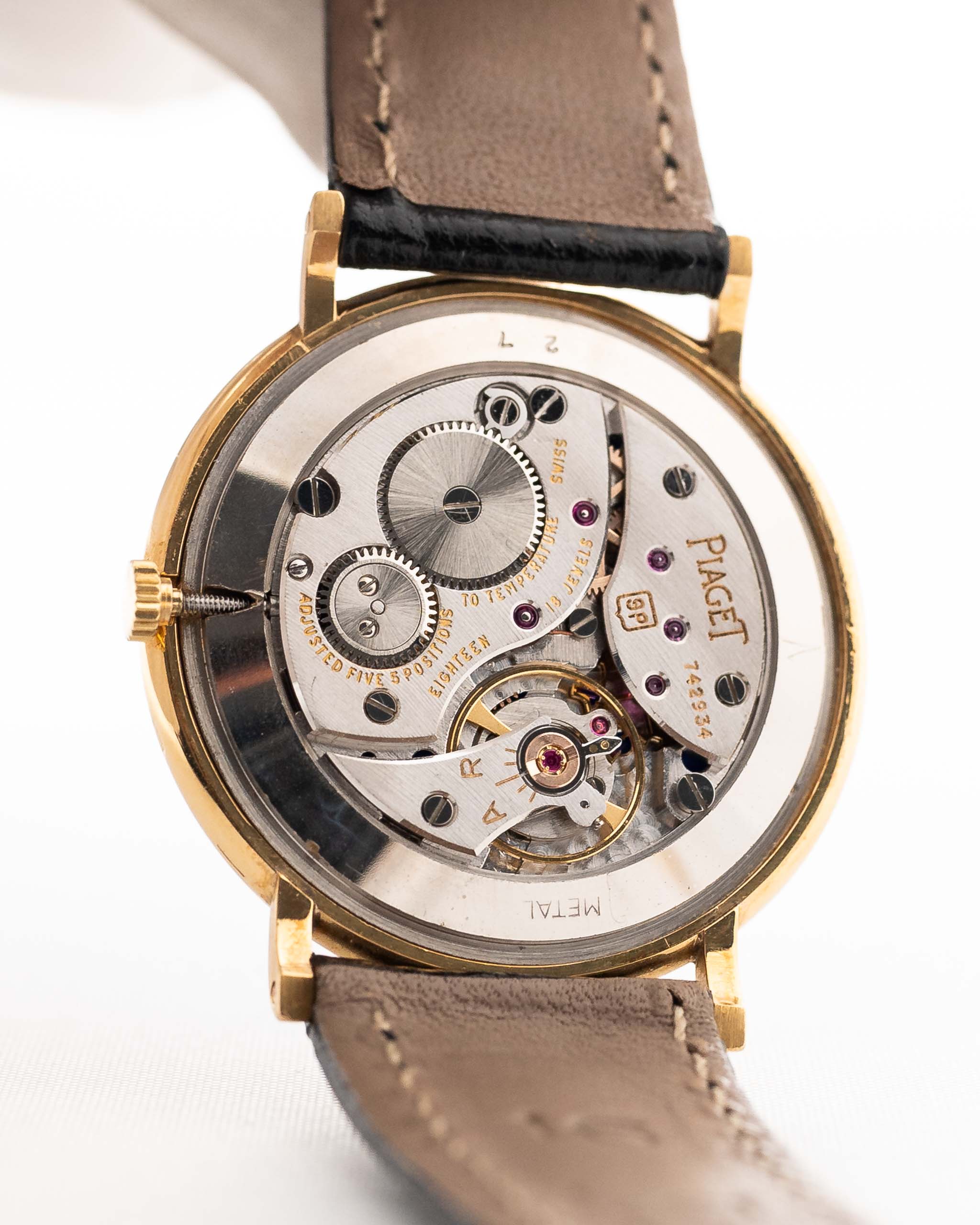 Cet exemplaire est accompagné de son bracelet en cuir noir Piaget d'origine et de sa boucle en or jaune 18 carats Piaget, complétant ainsi l'ensemble authentique et correct pour l'époque.