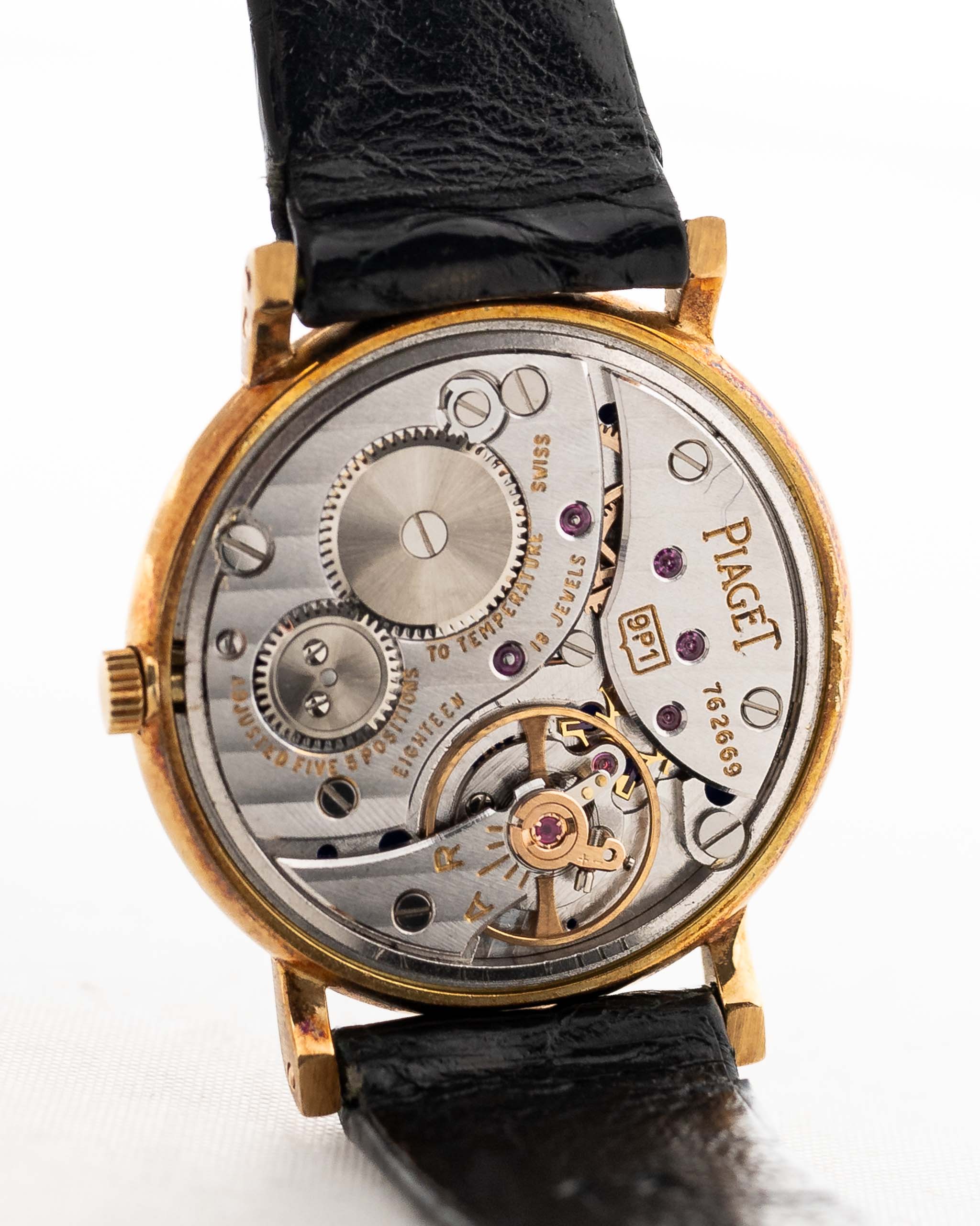 Sa minceur n'était pas seulement une prouesse technique, elle permettait aussi à la manufacture de monter des cadrans en pierres dures tout en conservant un profil fin, comme cette Piaget 18k impeccable avec un magnifique cadran en pierre de Lapislazuli et une patine très chaude sur le boîtier en or jaune 18k.
