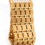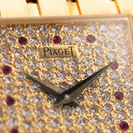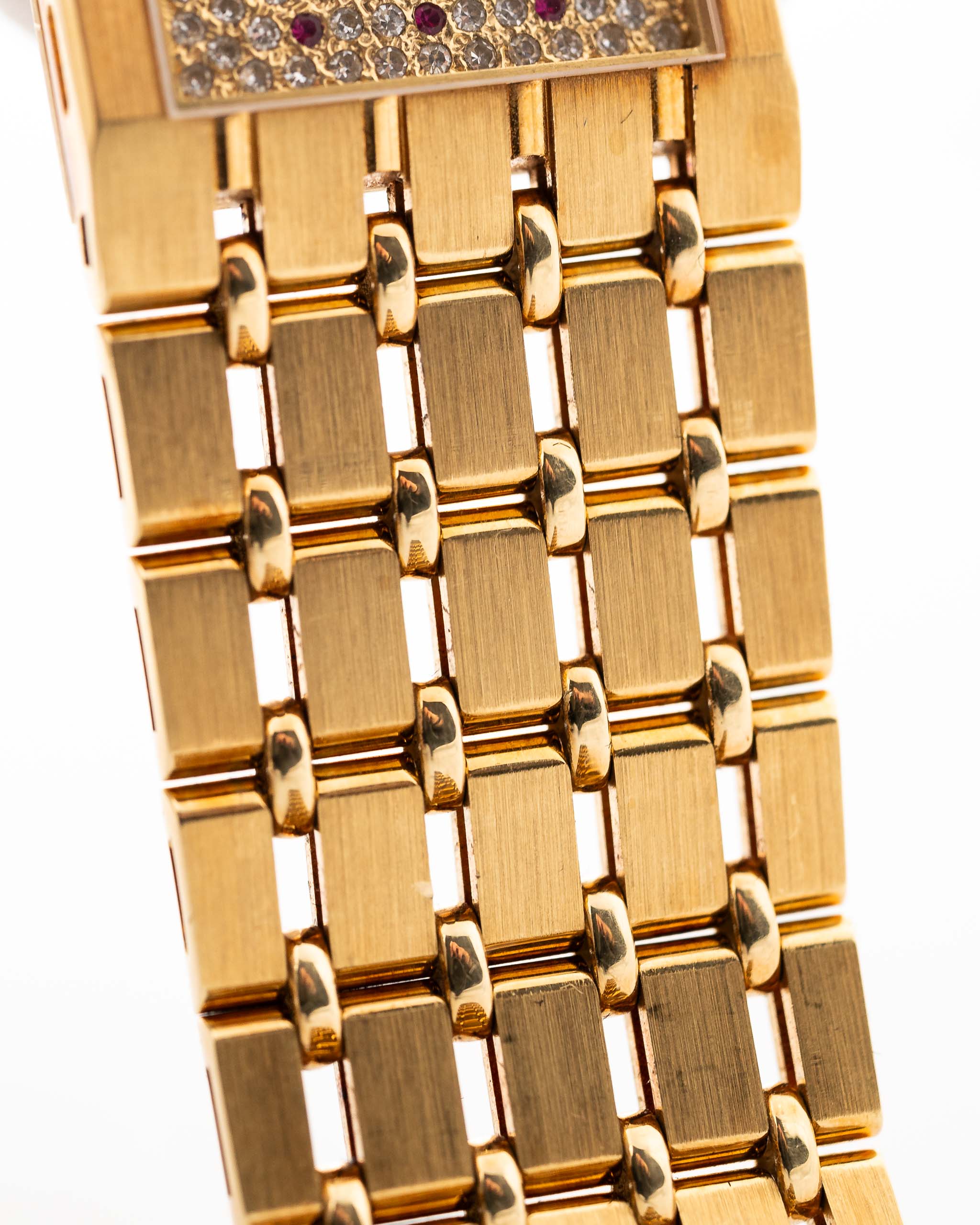 Les formes géométriques combinées au bracelet intégré en or jaune 18 carats et au sertissage de diamants blancs et rubis, à l'aiguille alpha et au logo classique de Piaget constituent une véritable œuvre d'art.