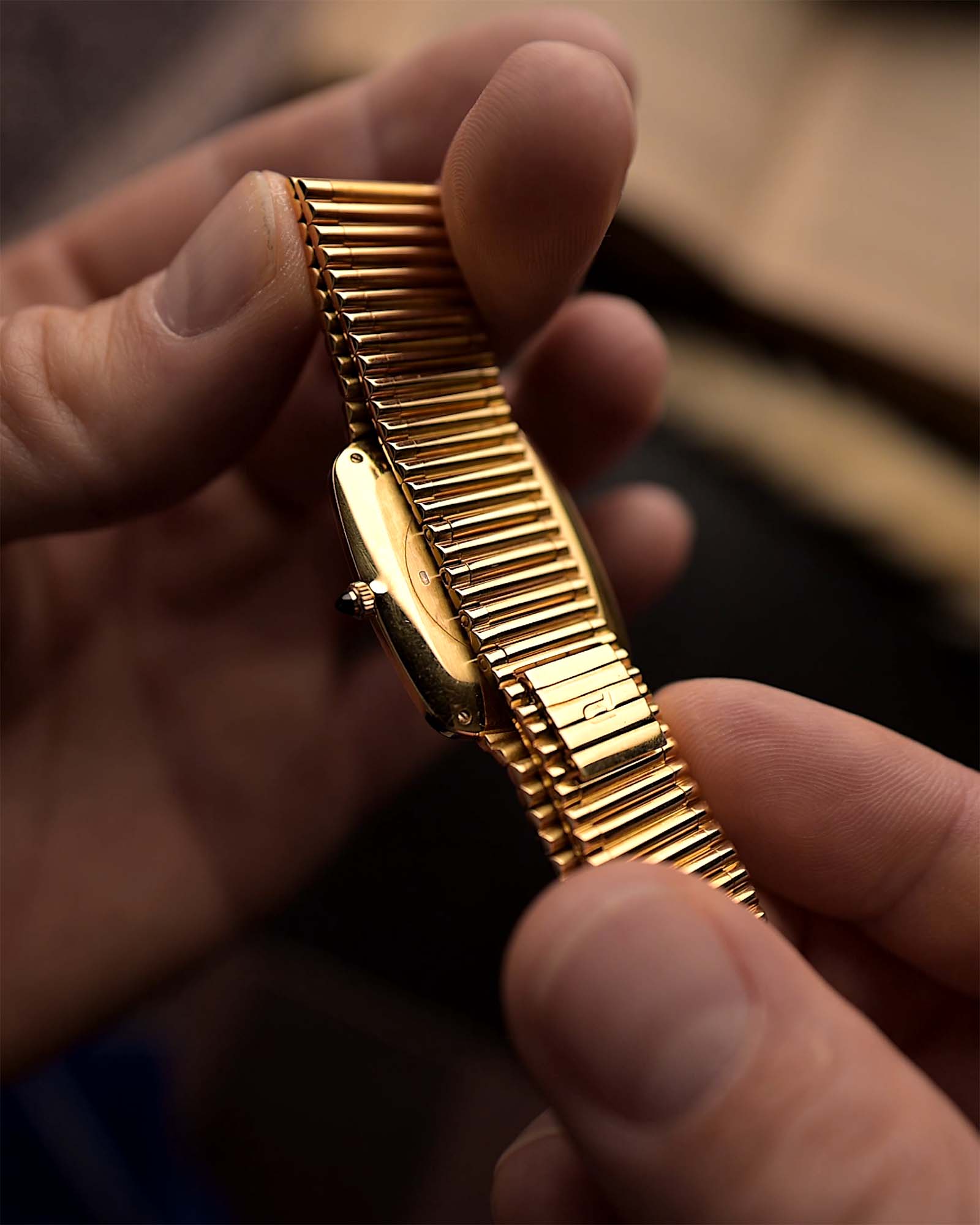 Le cadran est un rêve minimaliste : une finition dorée soleillée impeccable avec une minuterie extérieure nette, associée à des aiguilles fines et à une couronne à cabochon en saphir. Mais ce qui distingue vraiment ce modèle, c'est le bracelet intégré en or jaune 18 carats de type "bambou " - un détail rarement vu et hautement collectionnable qui élève l'ensemble de la pièce au rang d'œuvre sculpturale portable.