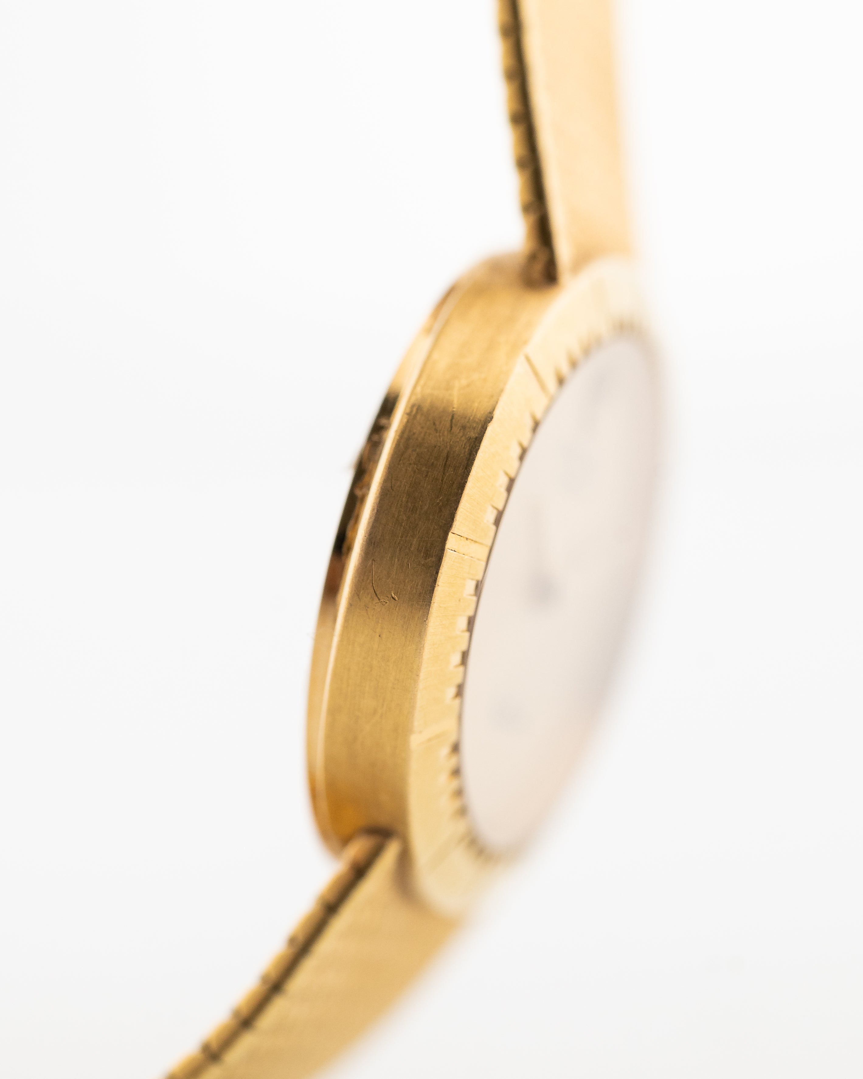 La couleur du cadran est l'or jaune, qui était une couleur populaire pour les montres habillées produites à cette époque (comme le montre le modèle contemporain Ellipse de Patek Philippe). La montre est livrée avec un bracelet intégré en or jaune 18 carats en parfait état.