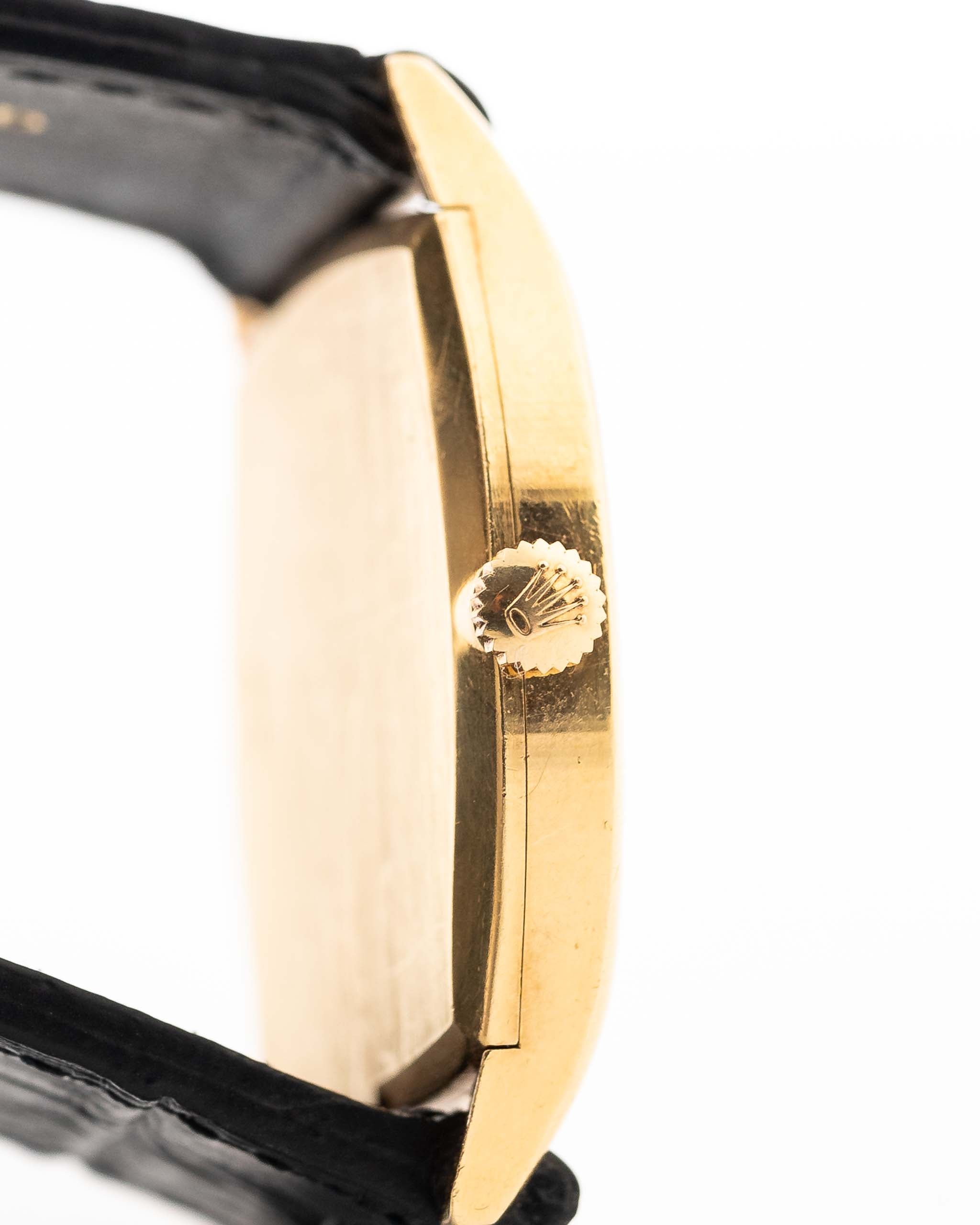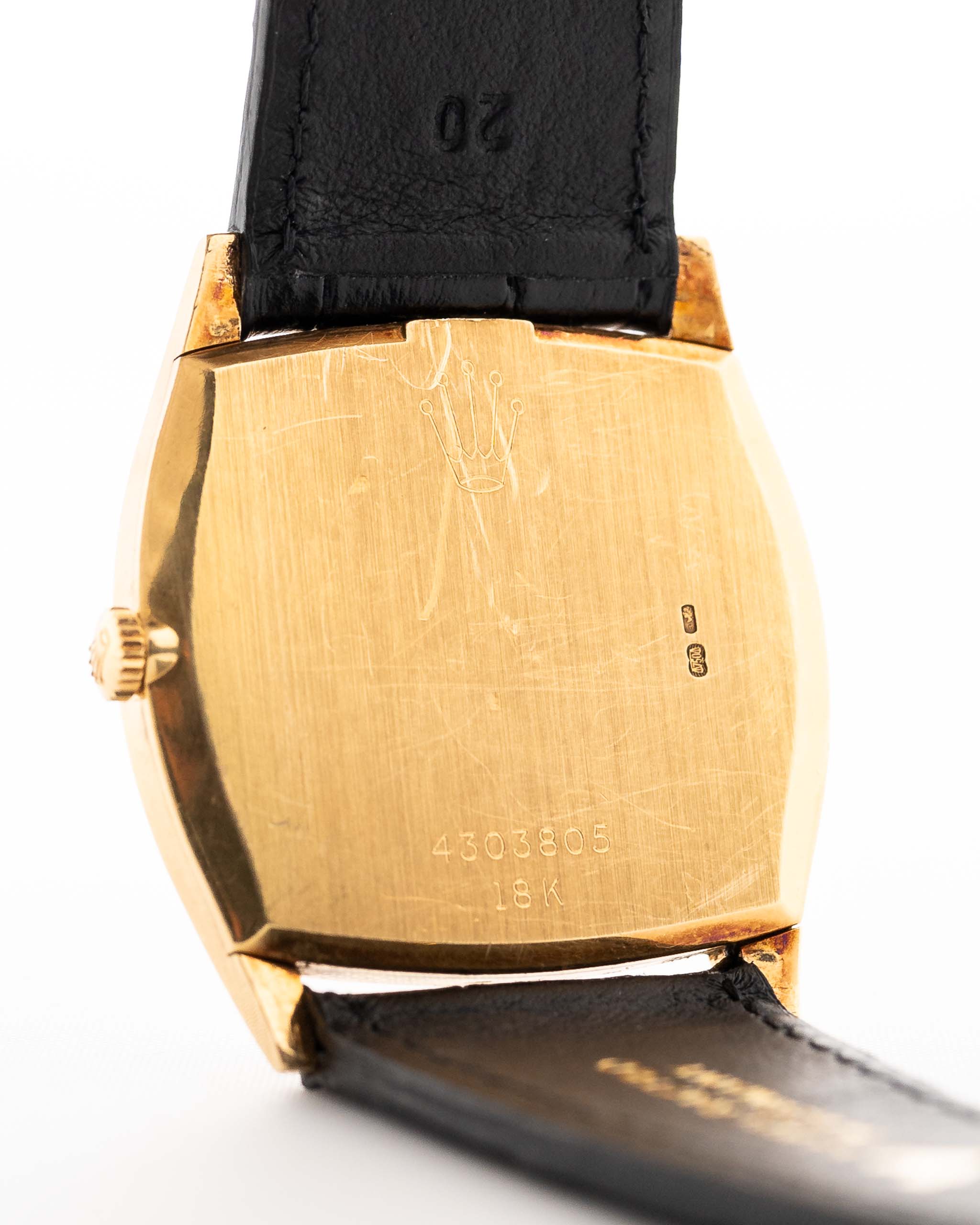 C'est dans la ligne Rolex Cellini que la marque exprime son art de la montre habillée, et cette référence 3805 de 1975 est un exemple audacieux de cette vision. Réalisée en or jaune 18 carats, cette pièce rompt avec la tradition Rolex avec un boîtier carré, offrant une présence au poignet plus sculpturale et plus raffinée.