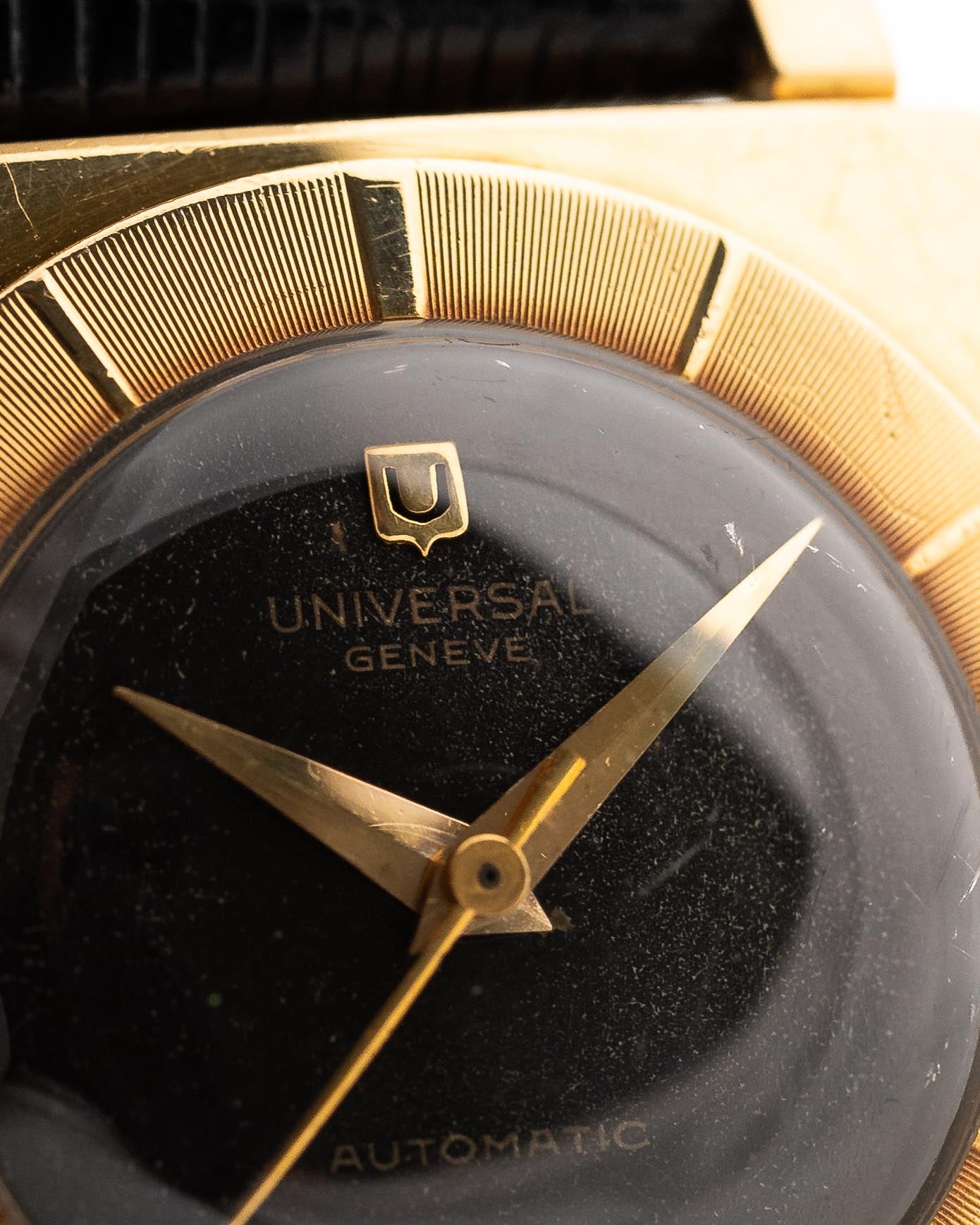 Cette Universal Genéve Square en or jaune 18 carats est vraiment spéciale et vous ne la verrez pas souvent sur d'autres poignets. Elle n'a été produite que sur une période de 7 ans au milieu des années 1950. Elle présente certains éléments de la Polerouter, comme la lunette, qui n'est pas triomphante sur le cadran comme d'habitude, mais sur le boîtier carré en or jaune 18 carats. Ce détail de conception dégage une magie différente et crée une présence surprenante au poignet.