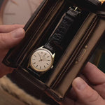 Fabriqué en or jaune 18 carats, le boîtier mesure un généreux 36 mm, offrant une proportion vintage parfaite avec une portabilité contemporaine. Le cadran argenté épuré, avec index et aiguilles en or, est un chef-d'œuvre de minimalisme, permettant aux lignes exquises du boîtier d'occuper le devant de la scène.