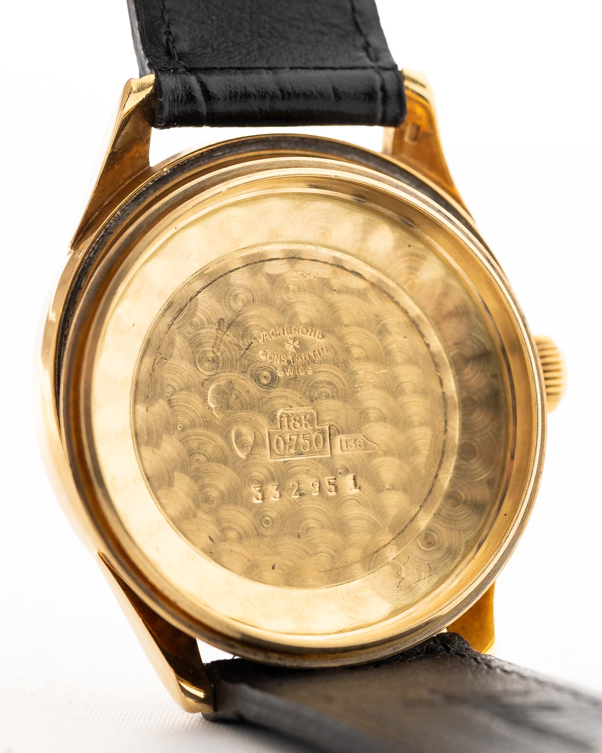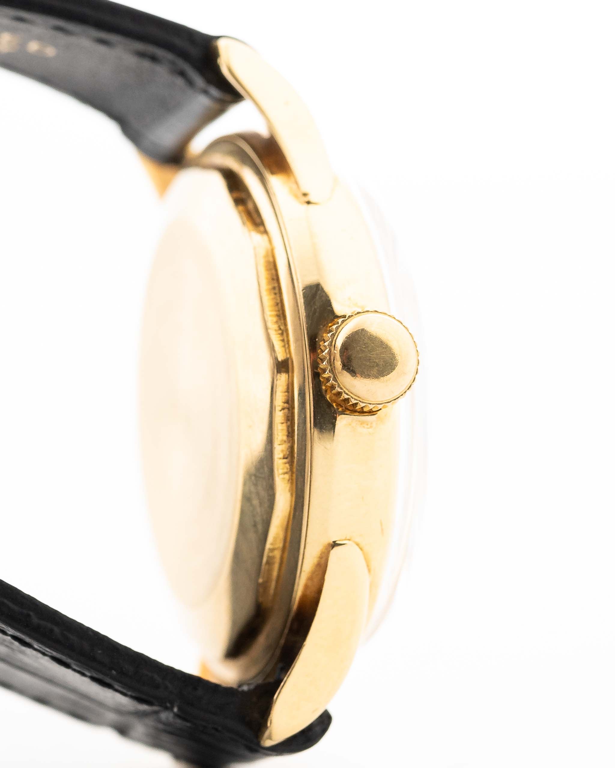 Véritable rareté, cette montre habillée en or jaune 18 carats est emboîtée par la légendaire maison C.R. Spillmann & Co. connue pour ses boîtiers étanches pour les chronographes de l'époque - et que l'on voit rarement sur les pièces de Vacheron. Le cadran couleur champagne présente une belle finition bicolore avec une disposition arabe 12-3-6-9, une minuterie intérieure et de fins index bâtons en or - tous parfaitement conservés et d'origine.