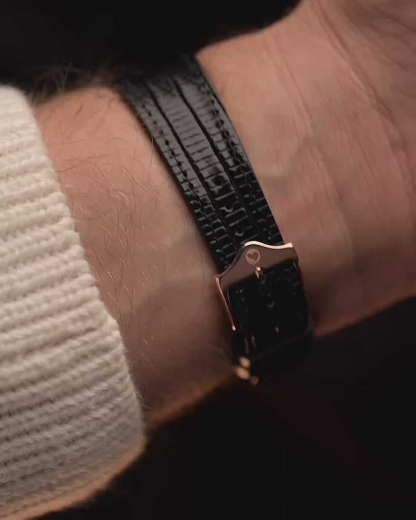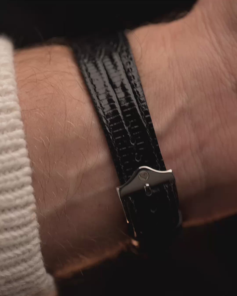 Fabriqué à partir du cuir de veau le plus fin, le bracelet en lézard KARDINAL présente une texture étonnante. Il présente un véritable caractère vintage sans utiliser de peaux exotiques. Il est ultra fin (2 mm), parfaitement effilé et confortable dès le premier jour.