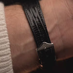 Crafted from fine italien calf leather, the embossed lizard pattern provides an exotic, shiny texture while remaining sustainable. At just 2 mm thin, it fits your wrist perfectly from the first wear. The unique tapered shape is a discreet complement and builds a well deserved frame for your classic vintage watch.