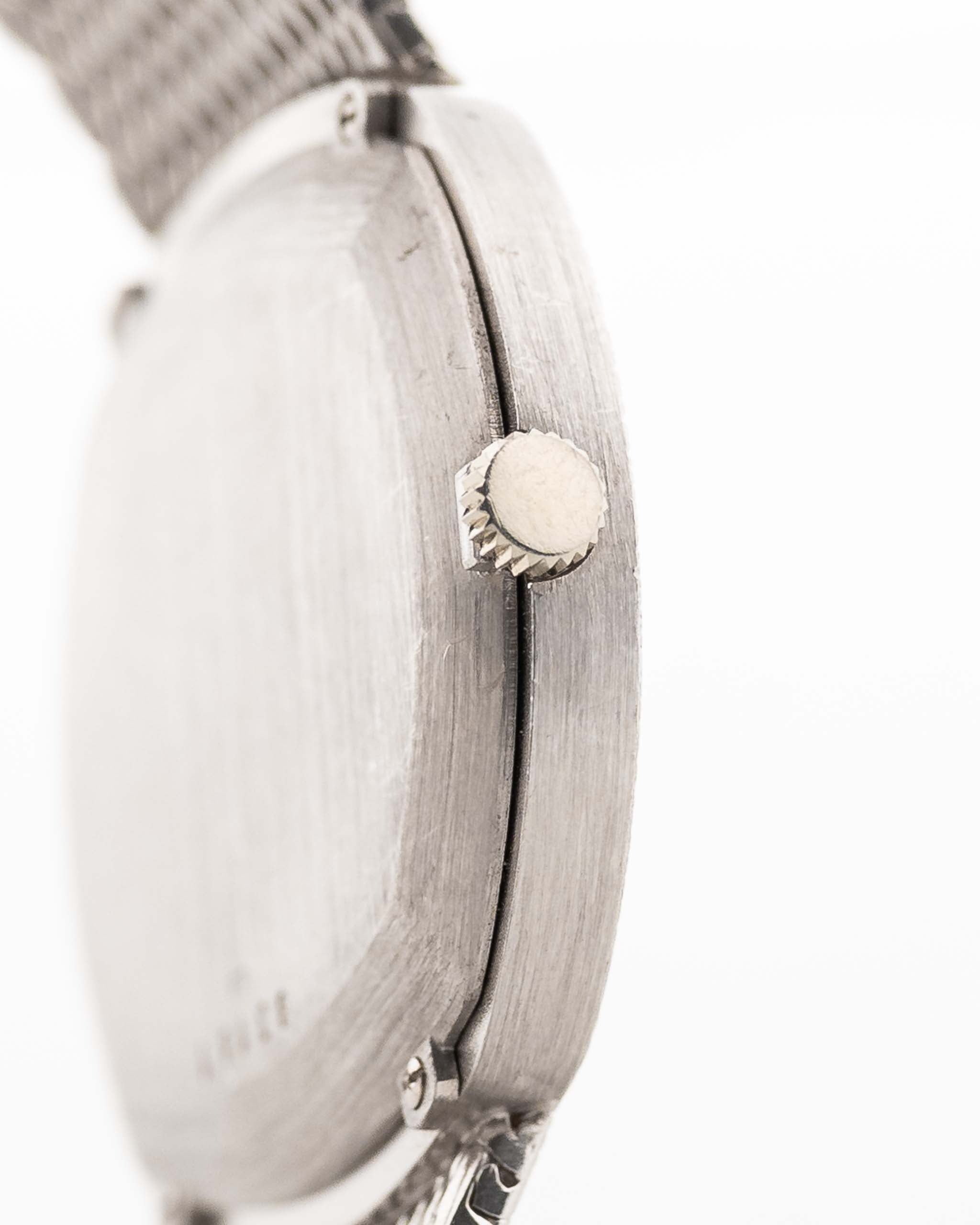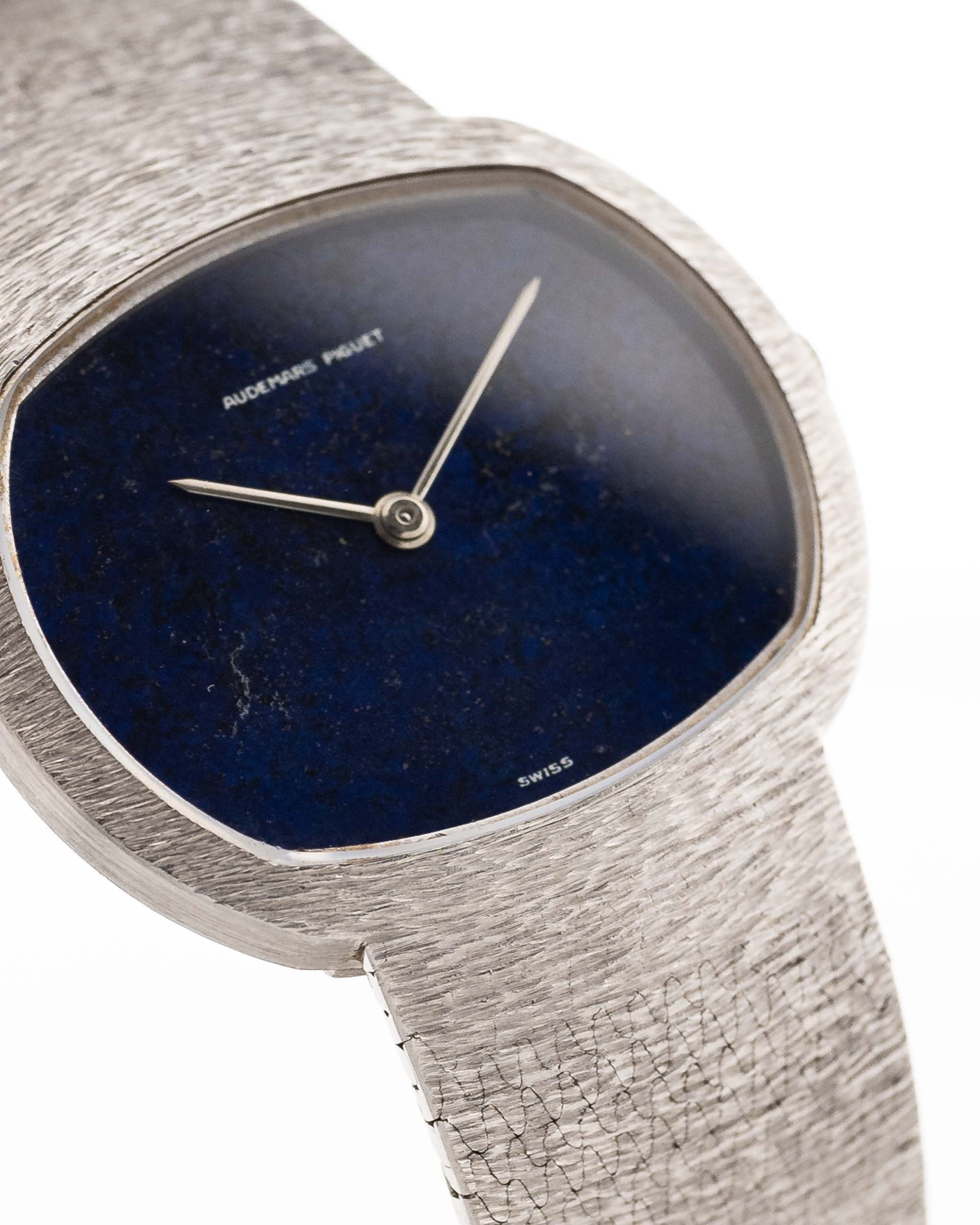 Le boîtier en or blanc 18 carats, d'un diamètre de 32 mm, est en parfait état et s'accompagne d'un bracelet unique en or blanc 18 carats. La cerise sur le gâteau est le rare cadran en pierre de Lapislazuli bleue.