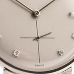 Le cadran argenté présente des index diamantés sertis en usine - subtils, équilibrés et indubitablement luxueux. Associé aux fines aiguilles bâton et à la disposition minimaliste, il crée une esthétique discrètement sophistiquée qui semble intemporelle, même aujourd'hui.