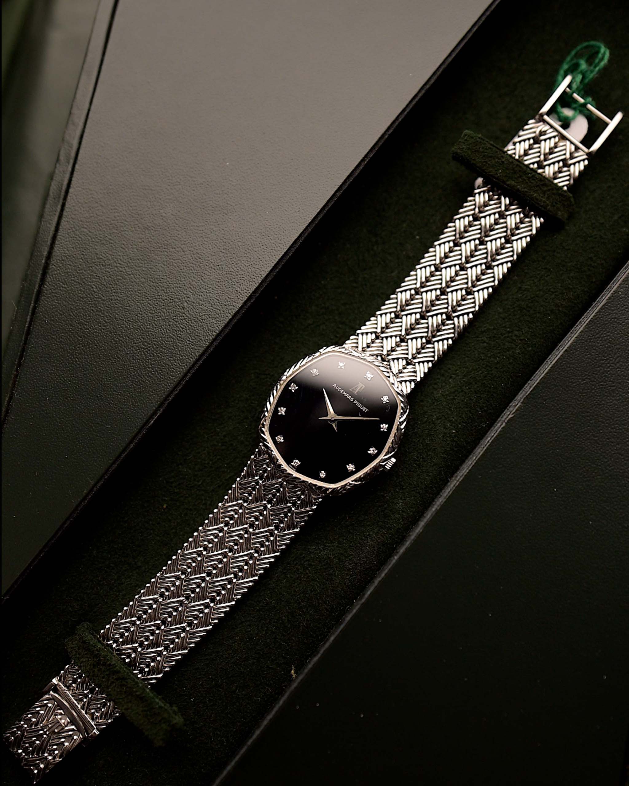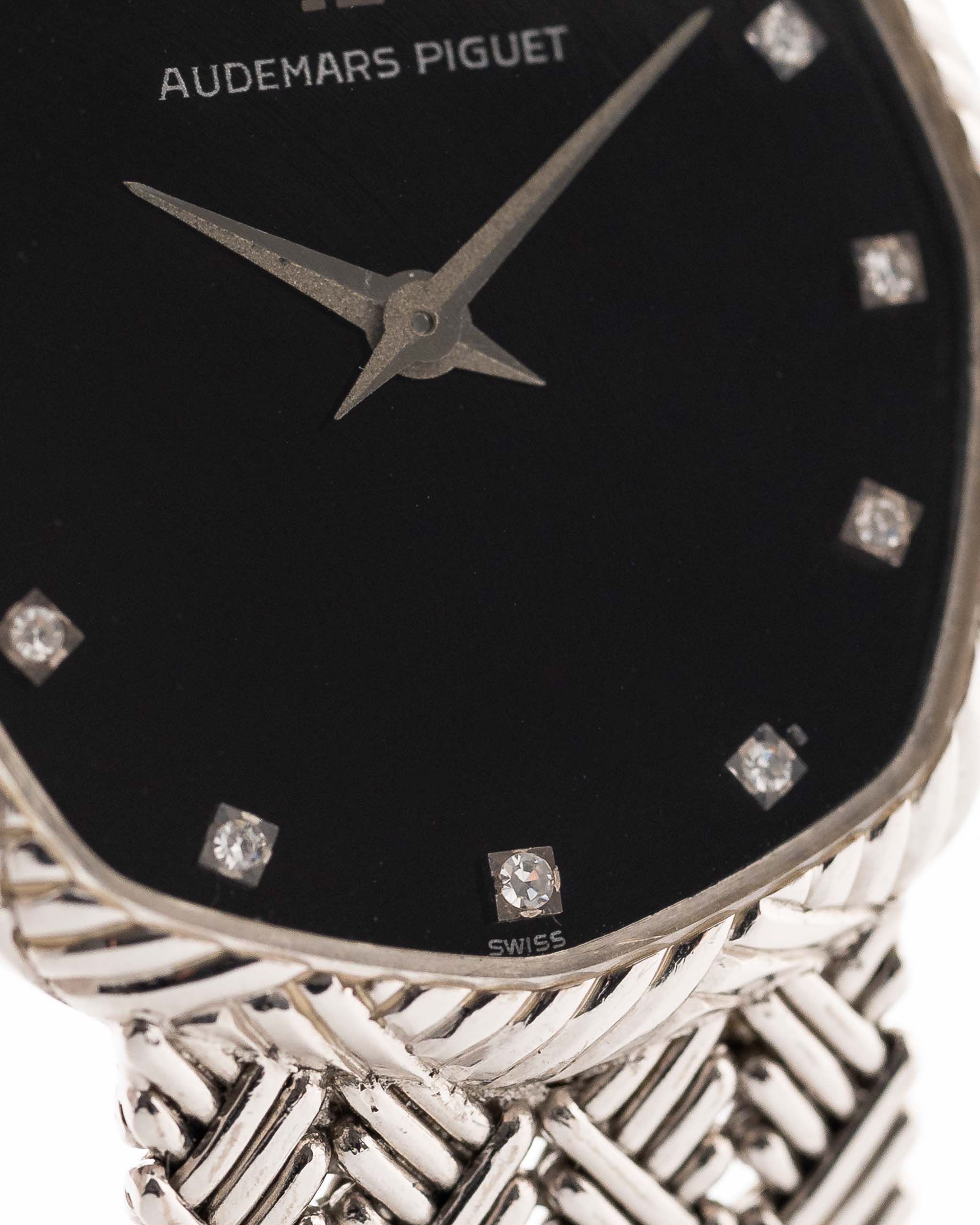 Cette rare Audemars Piguet de la fin des années 1970 est un exercice d'opulence tranquille. Entièrement réalisé en or blanc 18 carats, son boîtier octogonal-elliptique unique abrite un cadran en onyx noir impeccable, ponctué de douze index en diamants sertis en usine - le luxe discret dans toute sa splendeur.