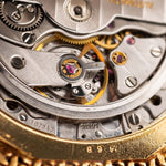 Cette montre habillée Audemars Piguet des années 1970 se distingue par son rare boîtier décagonal étagé, entièrement réalisé en or jaune 18 carats. Le jeu de géométrie et de texture se poursuit avec le cadran ovale doré, dont la finition subtilement chatoyante accroche la lumière à chaque mouvement.